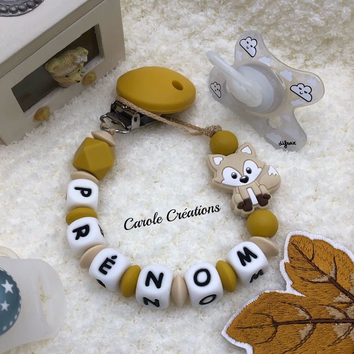 Attache tétine renard moutarde en silicone personnalisé
