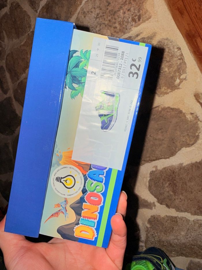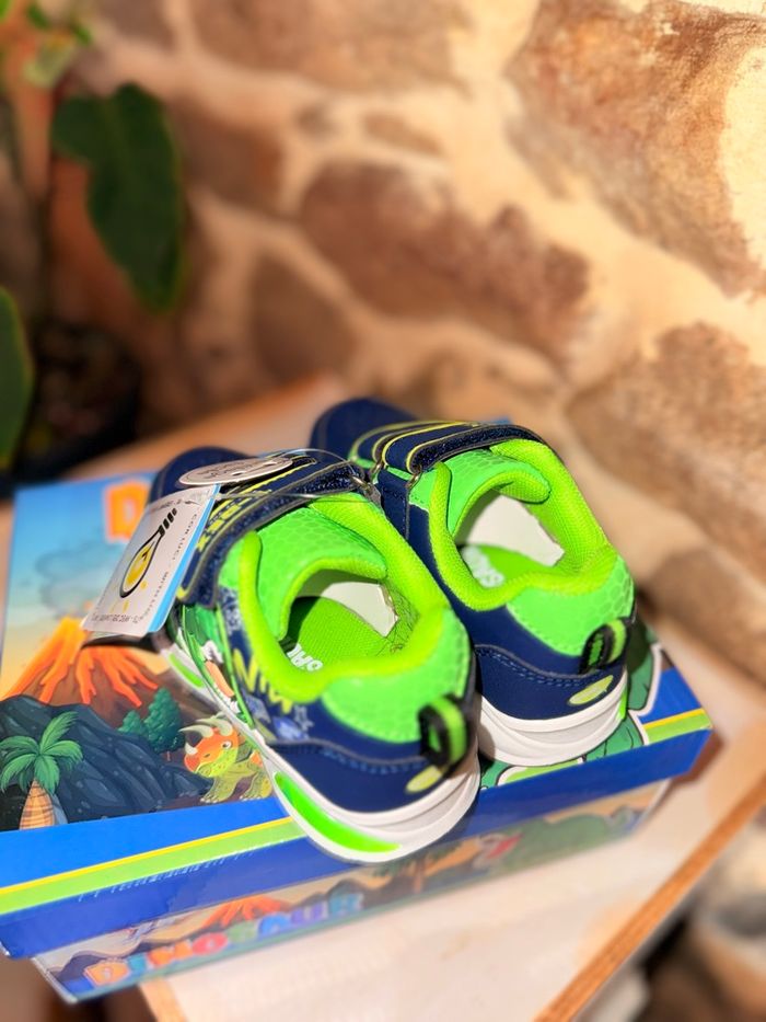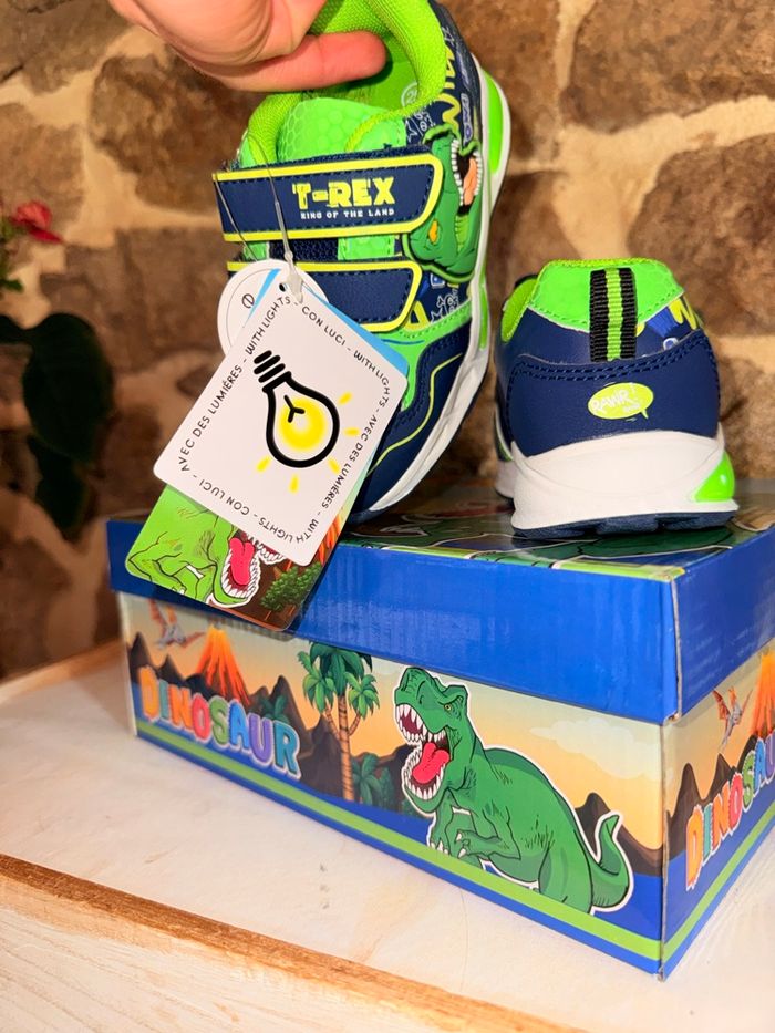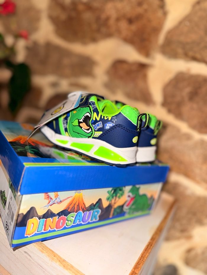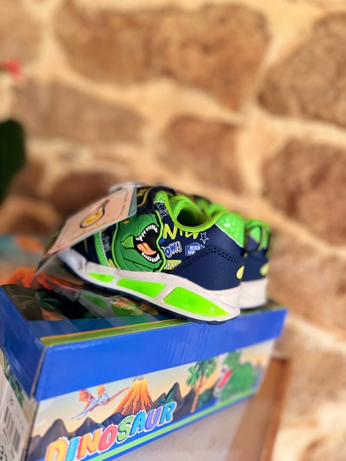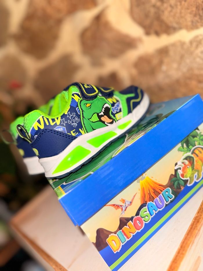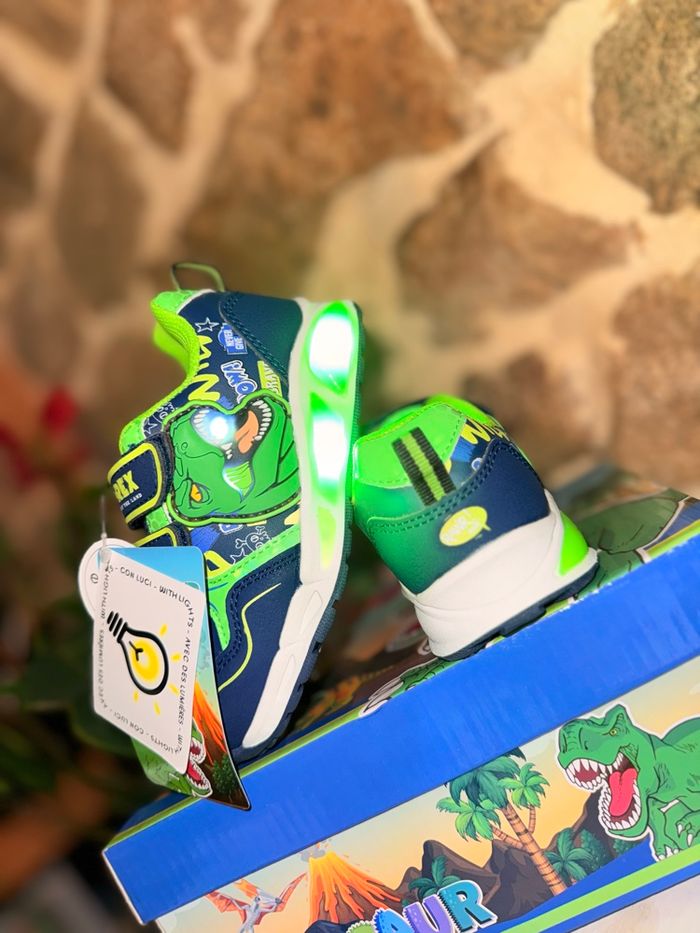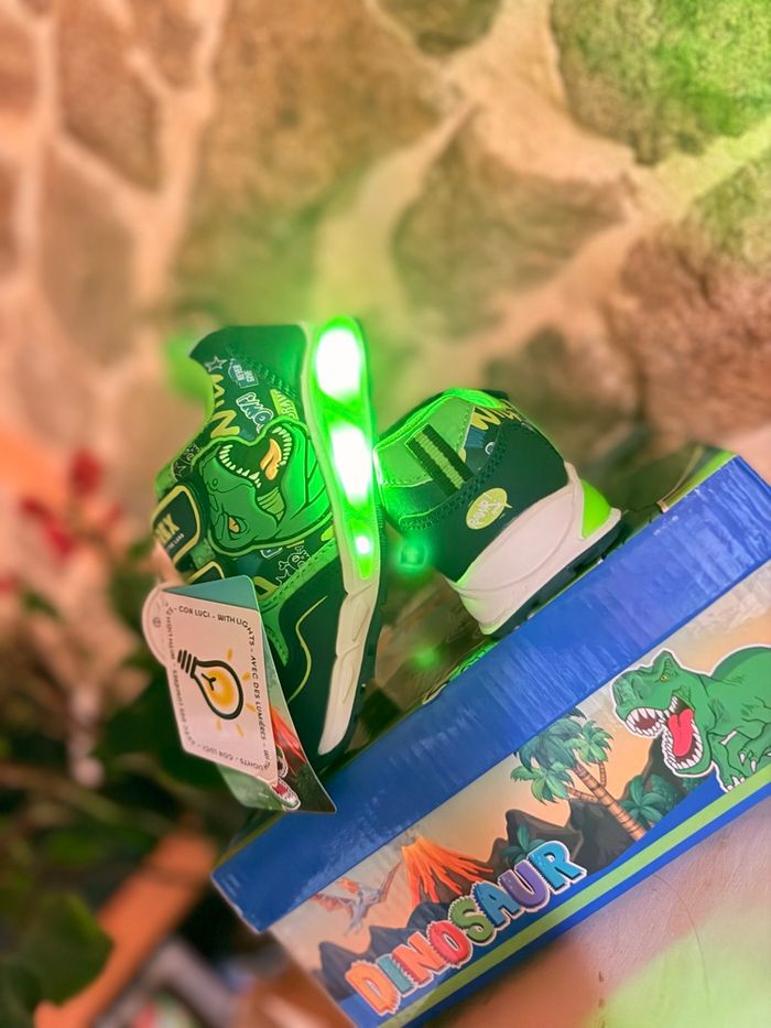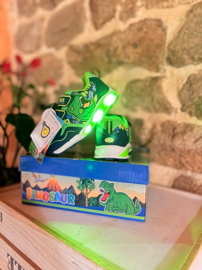 Baskets Dinosaures Lumineuses (Neuves) État : Neuf avec étiquette Prix boutique : 32,99 € Superbes baskets T-Rex style Jurassic Park ! • Ultra lumineuses : La semelle ET les yeux du dinosaure s'éclairent intensément à chaque pas. Vendu avec sa boîte d’origine. État impeccable, jamais portées. #dinosaure #jurassicpark #trex #basketslumineuses #chaussuresgarcon #neufavecetiquette