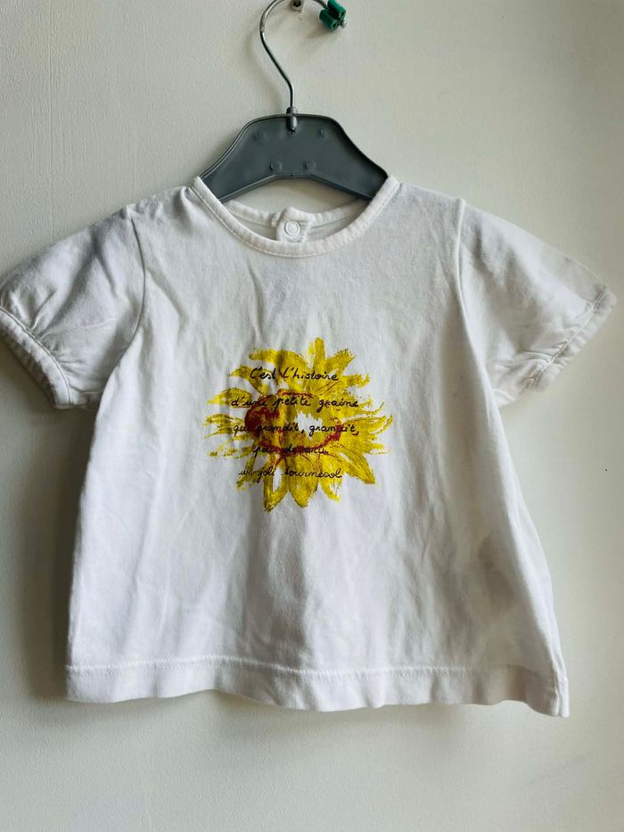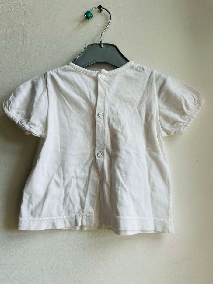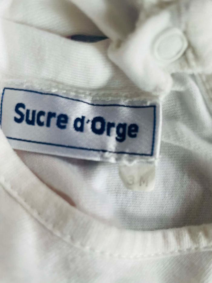 T shirt T 3 mois Marque "Sucre d'Orge" Blanc avec motif devant Boutons pressions dans le dos E coton Très bon état Envoie sous 48 h