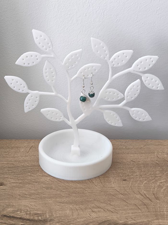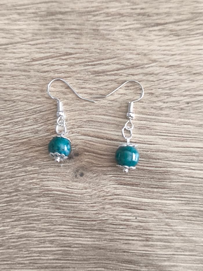Les boucles d'oreilles sont pendantes avec une parle bleu/vert