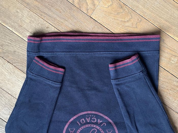Sweat marine avec détails bordeaux. Porté, tissu en très bon état, mais couleurs un peu passées, y compris sur le logo.