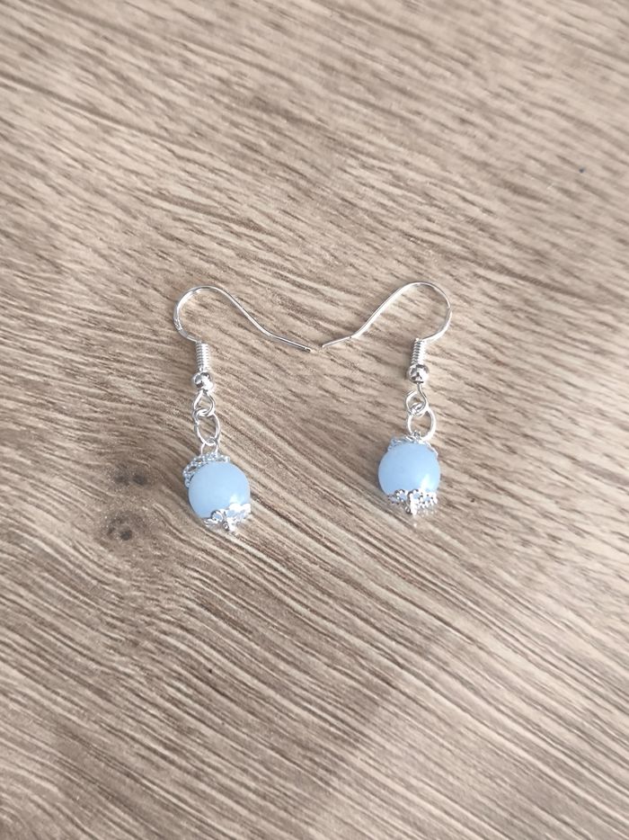 Les boucles d'oreilles sont pendantes avec perles bleues