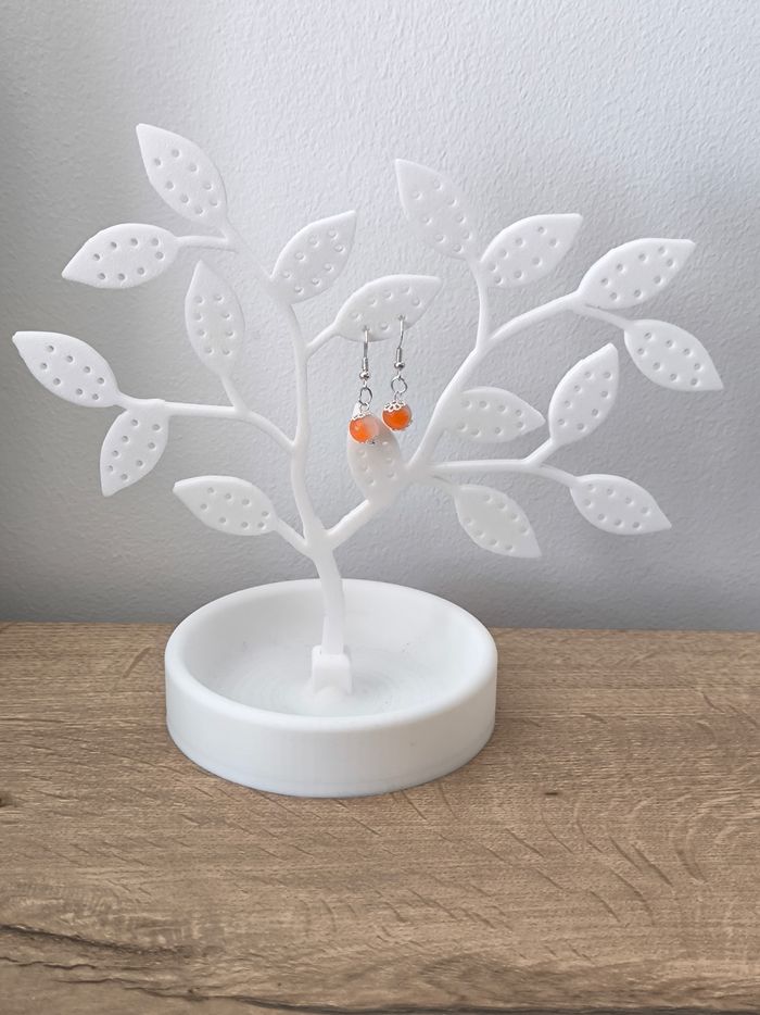 Les boucles d'oreilles sont pendantes avec perles orange et blanche