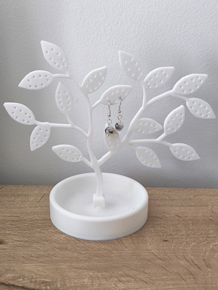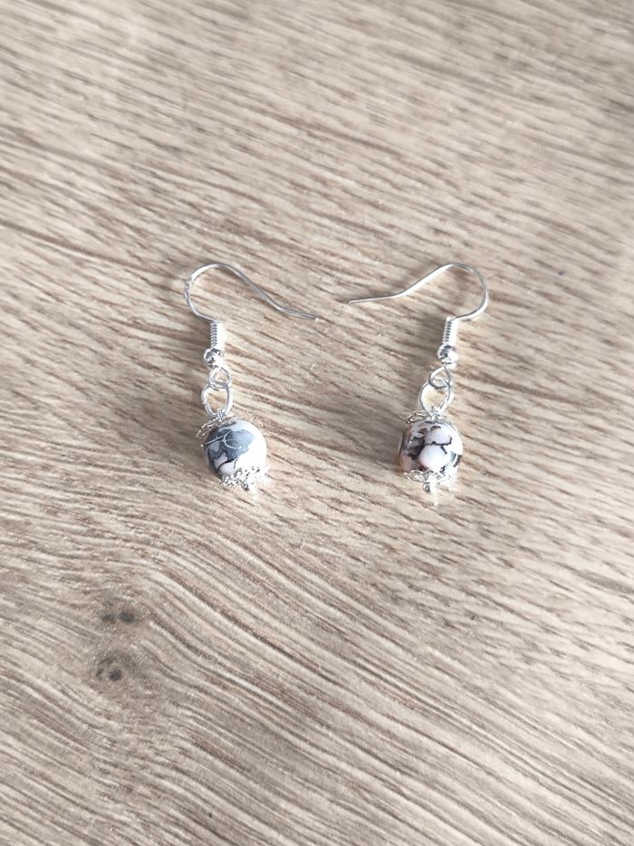 Les boucles d'oreilles sont pendantes avec perles blanches, noir, marron avec traits argenté