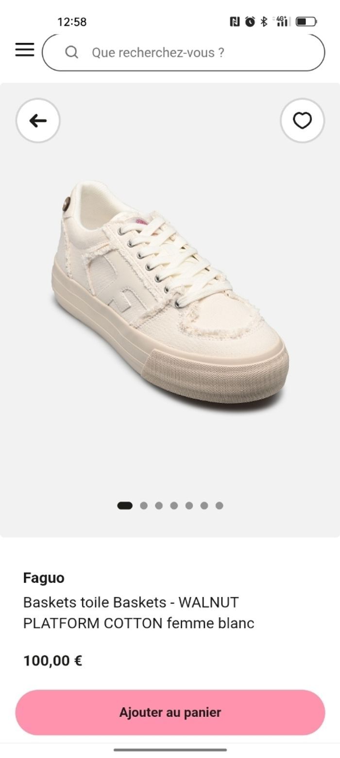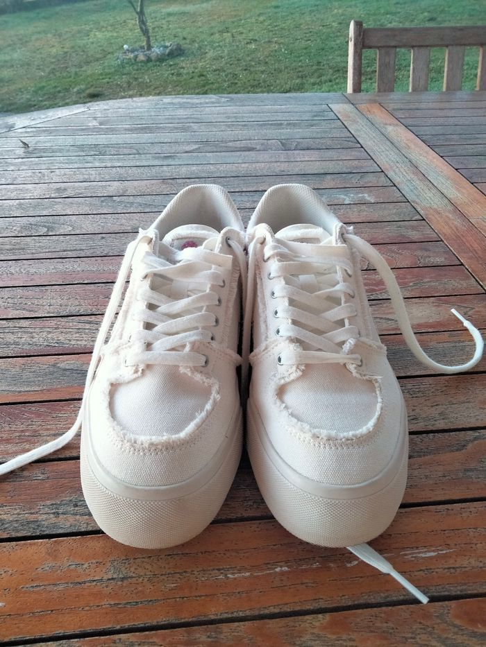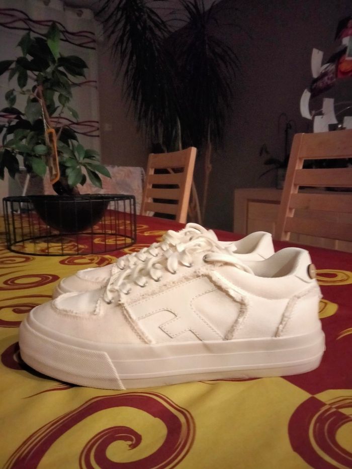 Basket femme en excellent état. État irréprochable. Porté seulement une journée. Matière: textile Doublure: textile Hauteur de talon: 4,5 cm Semelle intérieure : microfibre Semelle extérieure: elastomère Vendue avec une paire de lacets violet neuf qui appartiennent à ces baskets. Marque : Faguo Prix neuf : 100€ vendue 50€.
