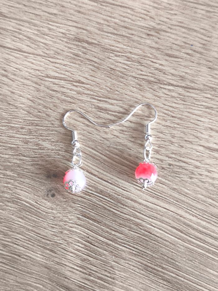Les boucles d'oreilles sont pendantes avec perles blanches et rouges
