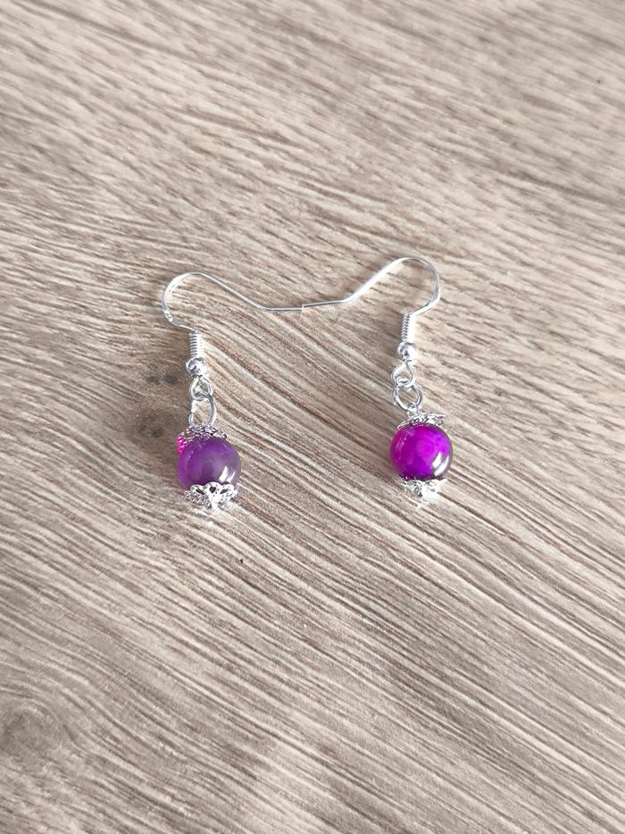 Les boucles d'oreilles sont pendantes avec perles violettes
