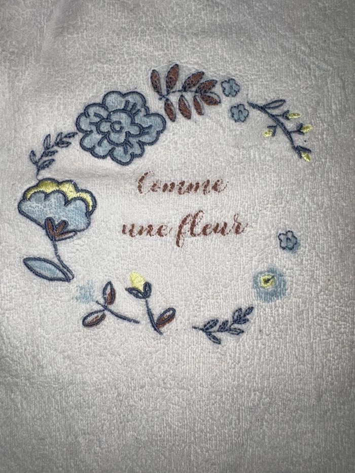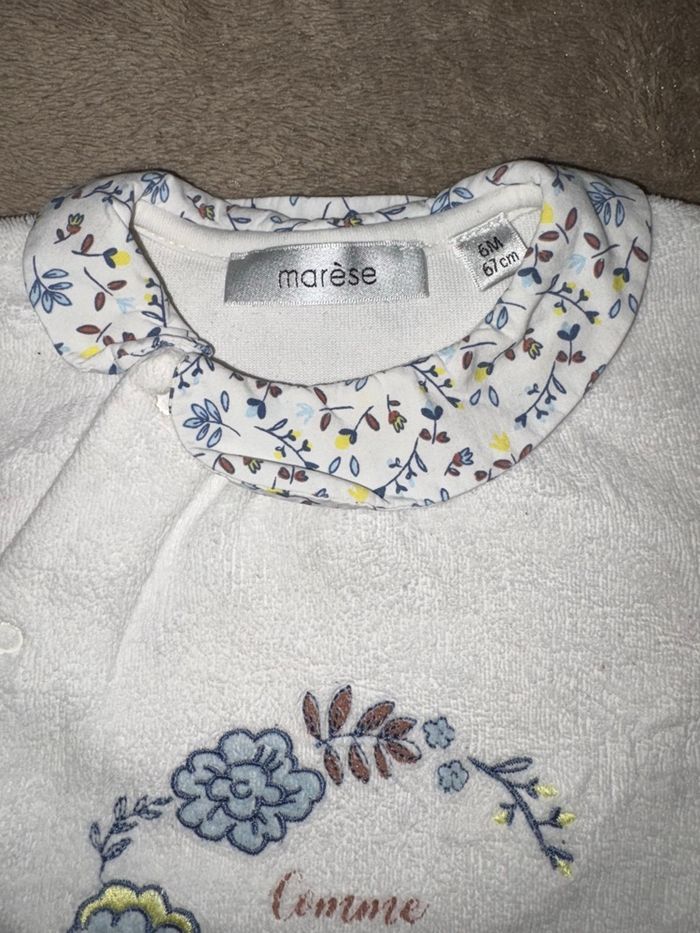 Pyjama/grenouillère blanc motif fleurs 6 mois (67cm) Marèse Très bon état hormis l’écriture qui est craquelé