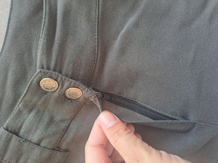 Pantalon Coupe droite , légèrement évasé dans le bas Attache avec fermeture éclair et boutons Couleur Kaki Taille 36 Pas d'étiquette de marque