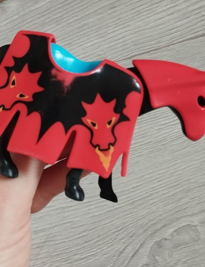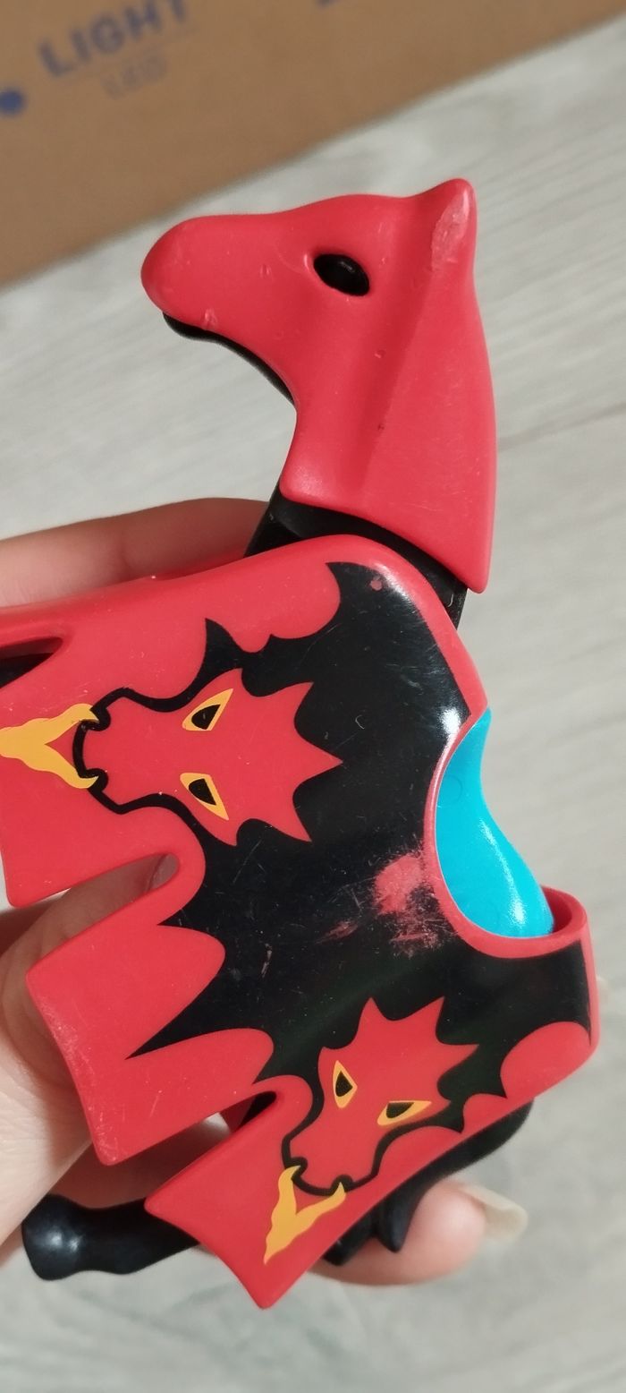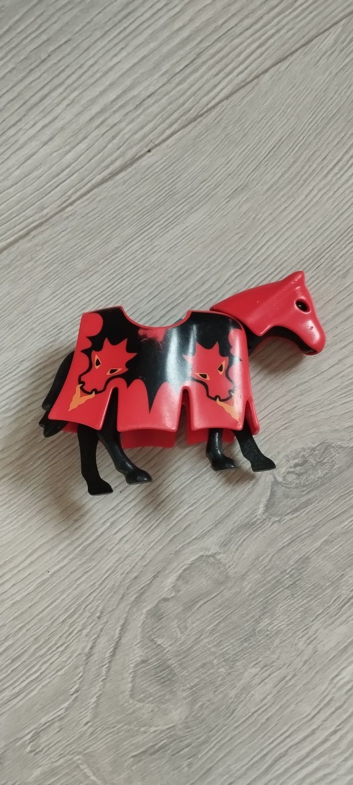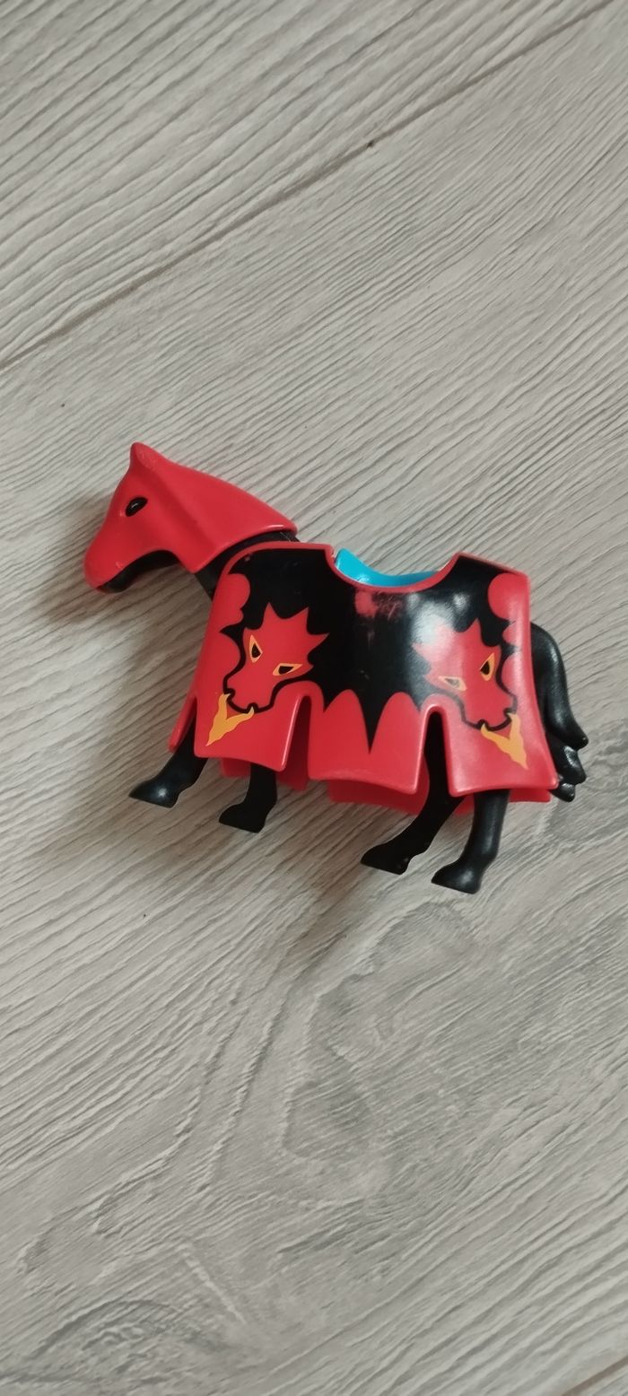 Bonjour, Je vends ce cheval avec cape rouge playmobil en bon état, couleur un peu parti voir photo