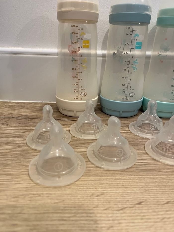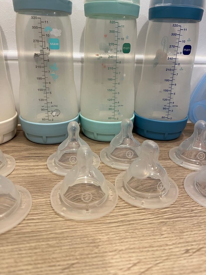 Biberons MAM ( il me reste le beige et bleu marine) + la boîte pour le lait + 4 tétines débit 1 + 2 tétines débit 2 + 4 tétines débit 3