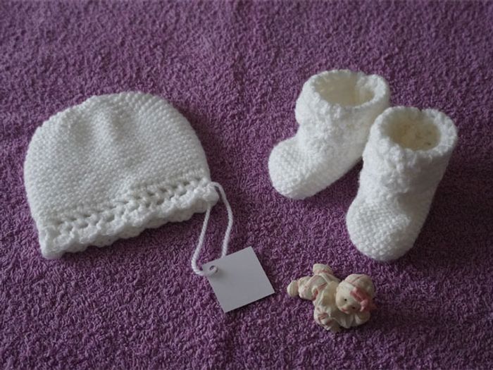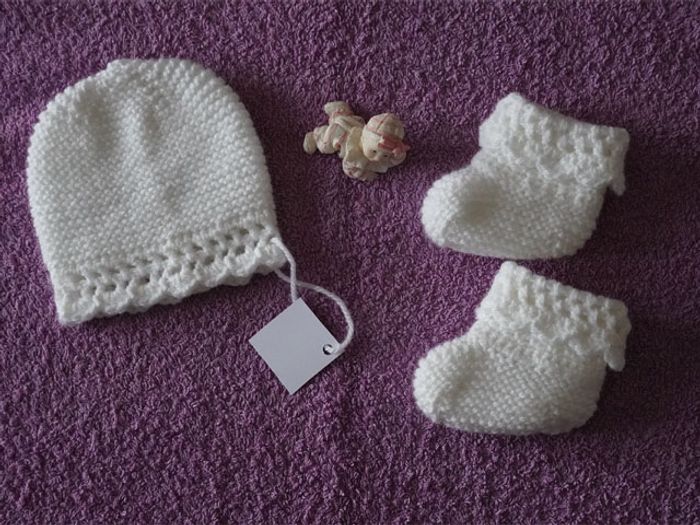 Joli ensemble blanc 0/3 mois neuf : Bonnet + chaussons - photo numéro 1