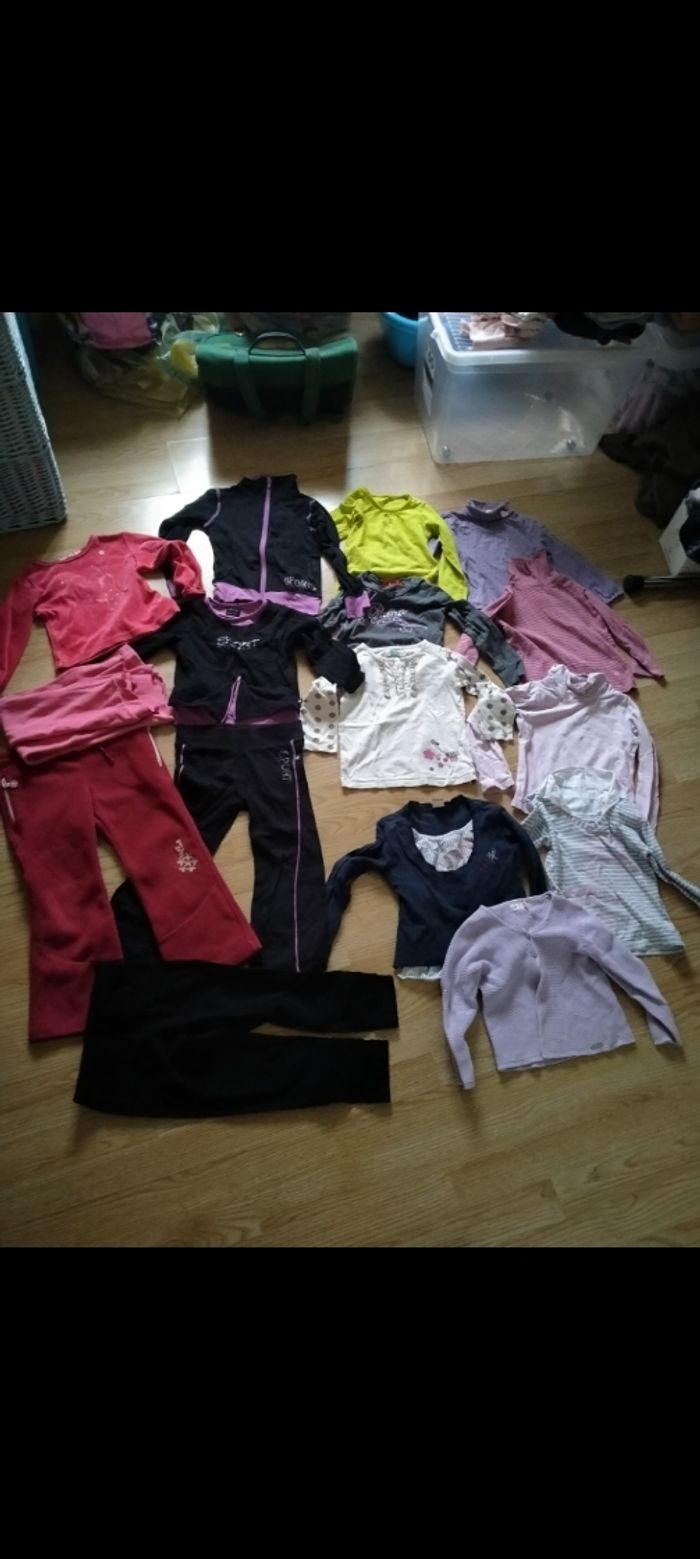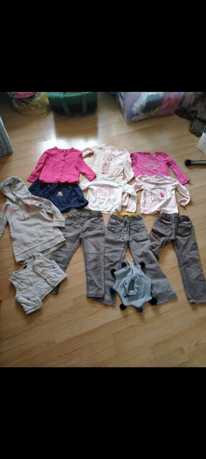 Lot de 28 vêtements fille. Hiver.  Taille 4 ans ❄️ Promo 28 Euros ❄️ Comprenant : Très bon état : Bonnet béret lapin. Veston gris. Kiabi. Jean gris. Influx. Robe pull capuche. la halle. Haut manches longues. Vertbaudet. Ensemble haut et jupe. tissaia. Pantalon chaud . sergent major. Jean gris. sergent major. Haut manches longues blanc. Kiabi. Lot de deux hauts manches longues. Vertbaudet. Bon état : Haut manches longues gris et blanc rayé mc baby. Haut manches longues bleu marine. IKKS. Haut manches longues. beige à pois. Vertbaudet. Ensemble 3 pièces sport. U oxygN. Haut manches longues gris. puma . Sous pull violet. Hello Kitty .  Bas jogging chaud. Bordeau. ZARA . Gilet violet. CND. Sous pull rose rayé. Sous pull rose. Pyjama chaud 2 pièces. la compagnie des petits. État satisfaisant: Haut manches longues vert. orchestra. Pantalon noir Des chaussettes mises en plus 🧦 D'autres photos et description de chaque article sur les annonces initiales sur mon v'nt'd ptitesev63. N'hésitez pas à me demander si besoin. D'autres articles disponibles dans cette taille en été. Maison non fumeur  ❄️28 Euros le lot ❄️