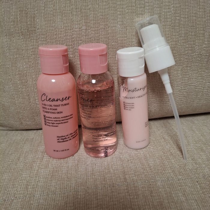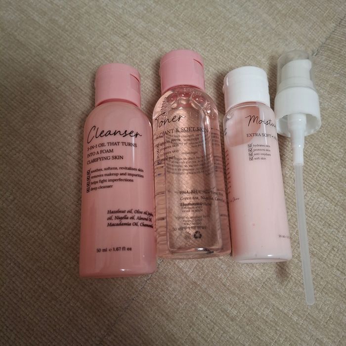 Lot de 3 produits marque maskin 1 lotion tonique 50ml 1 lotion nettoyante 3 en 1, démaquille, nettoie et élimine les imperfections 50ml 1 crème visage hydratante format 30ml avec push