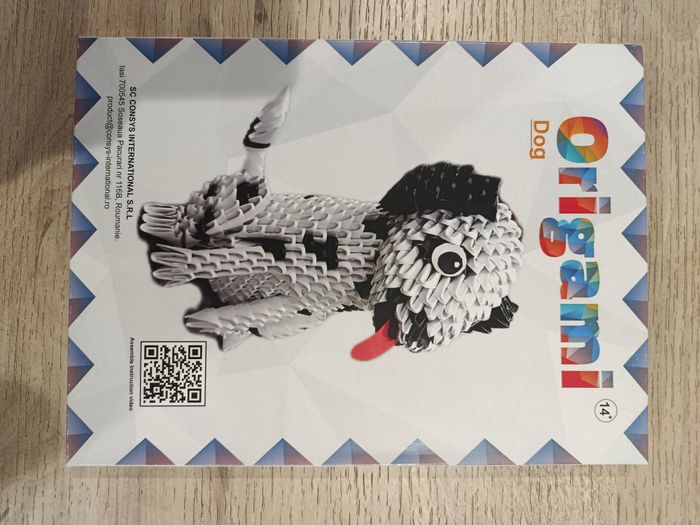 Kit créatif origami Chien. Le QR code vous permet d'accéder à une vidéo tutoriel pour monter cet origami (vérifié). Idéal pour les dimanche pluvieux. A partir de 14 ans.