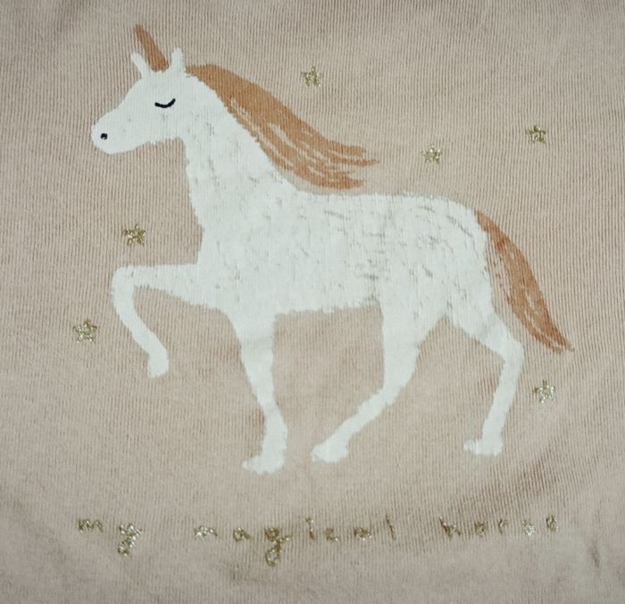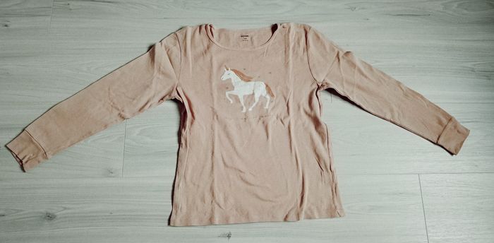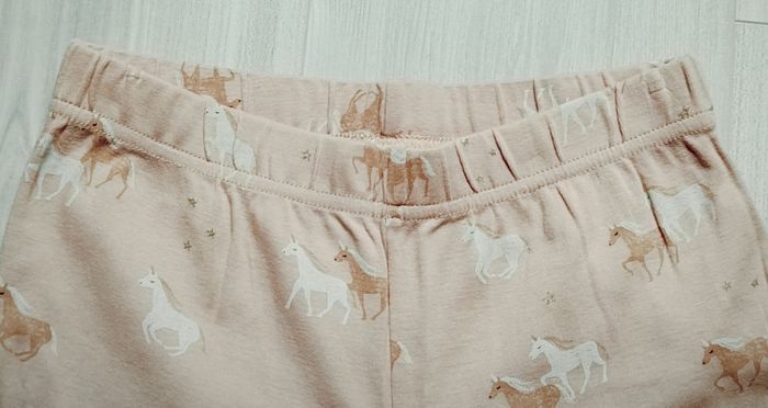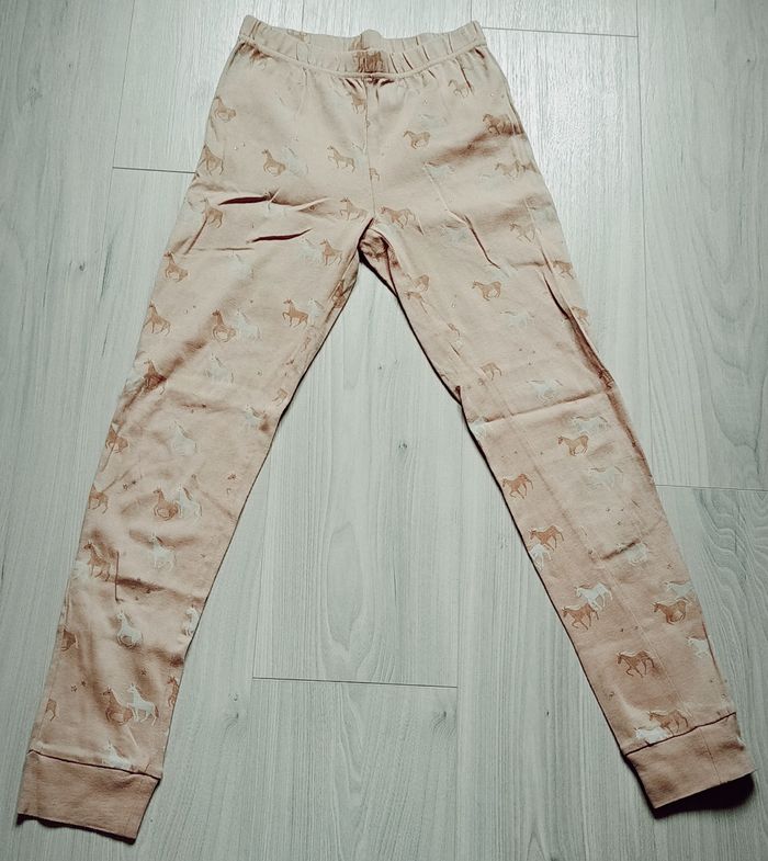 Pyjama deux pièces de couleur abricot, imprimé. - Haut à manches longues de couleur abricot. Encolure ronde. Dessin d'un cheval imprimé sur le devant avec inscription "my magical horse" en lettres dorées. Manches resserrées à leurs bases par une large bande de côtes - Pantalon de couleur abricot, imprimé de petits chevaux. Taille très élastiquée. Bas des jambes resserrés par une large bande de côtes. Marque Kiabi. Taille 14 ans (152/168 cm). N'a jamais été porté. Article neuf sans étiquette