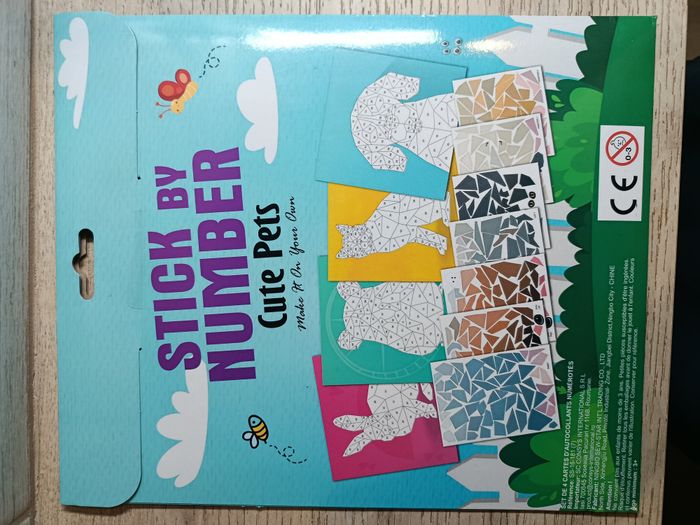 Mosaïque par numéro animaux. Set de 4 cartes d'autocollants. Ensemble d'autocollant à coller en suivant les numéros. Idéal pour occuper le temps des enfants et faire travailler leur concentration et leur patience. Neuf sous emballage Ne convient pas aux enfants de moins de 3 ans.