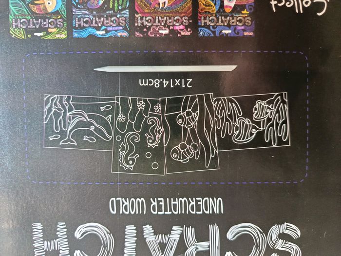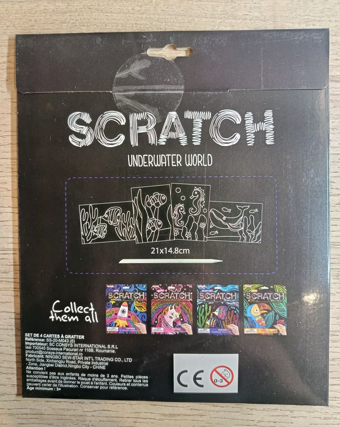 Cartes à gratter de l'univers aquatique. Neuf sous emballage, ces cartes permettent de travailler la patience et la minutie des enfants. Sont inclus 4 cartes à gratter ainsi qu'un bâtonnet à gratter en plastique. Ne convient pas aux enfants de moins de 3 ans.