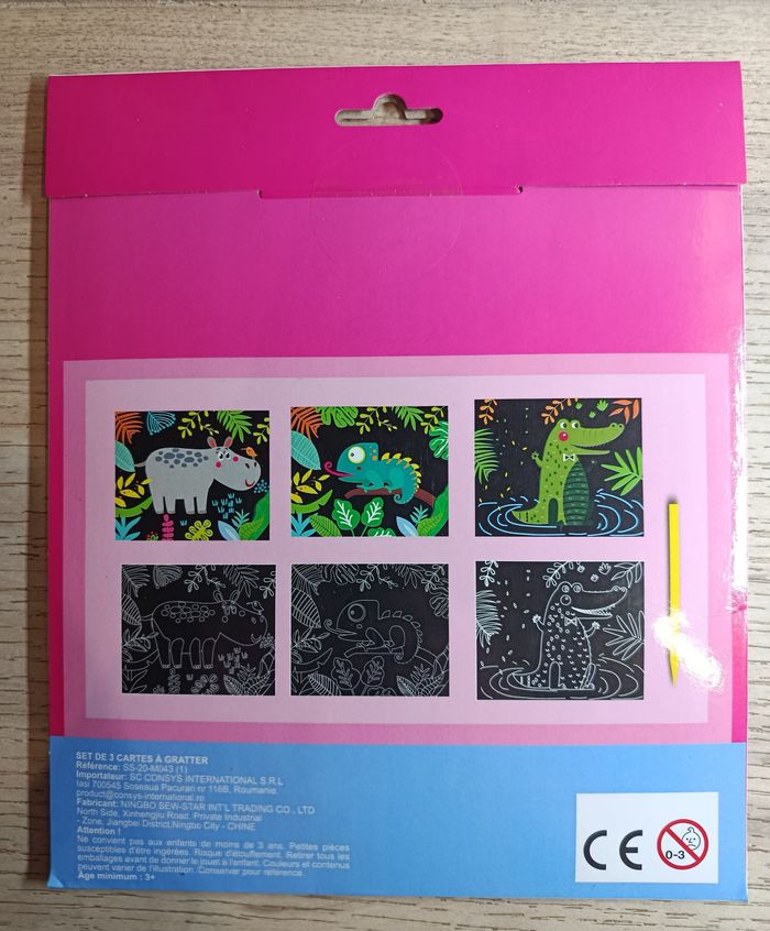 Cartes à gratter animaux de la jungle. Neuf sous emballage, ces cartes permettent de travailler la patience et la minutie des enfants. Sont inclus 3 cartes à gratter ainsi qu'un bâtonnet à gratter. Ne convient pas aux enfants de moins de 3 ans.