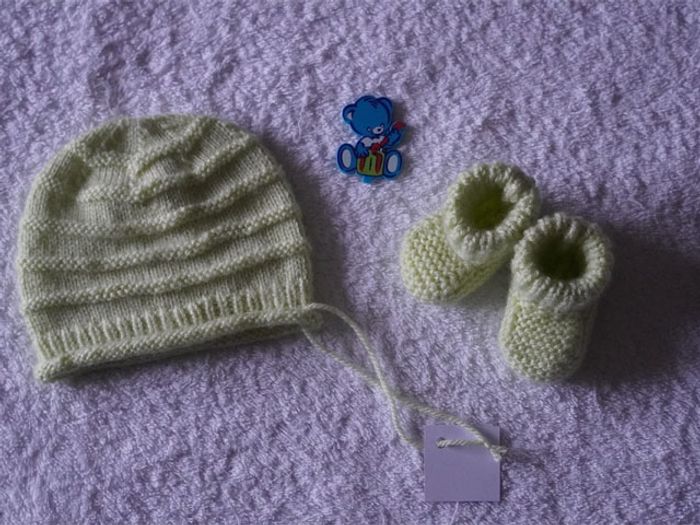 Ensemble vert clair neuf 0/3 mois : Bonnet + chaussons - photo numéro 1