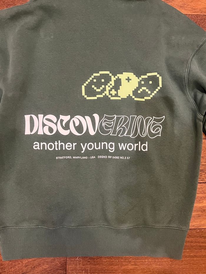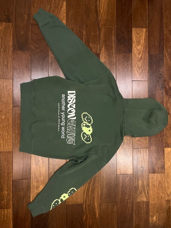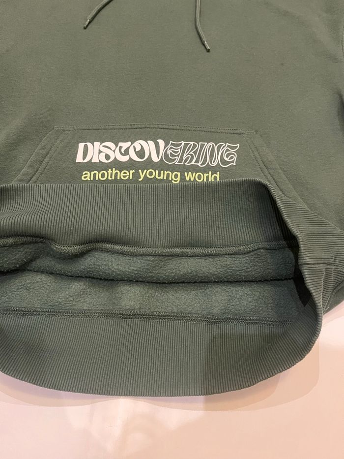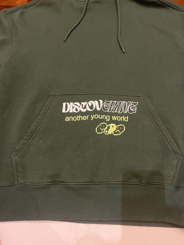 • Sweat à capuche oversize avec cordon pour resserrer avec poche à l’avant. Broderie sur la manche. Imprimé sur le devant, la manche et le dos «  discovering another young world » • acheté il y a quelques mois, je le vends car il est trop petit En très bon état • pull and bear taille XS • mesures : 61cm entre les épaules ,64cm de longueur ,54 cm entre les épaules