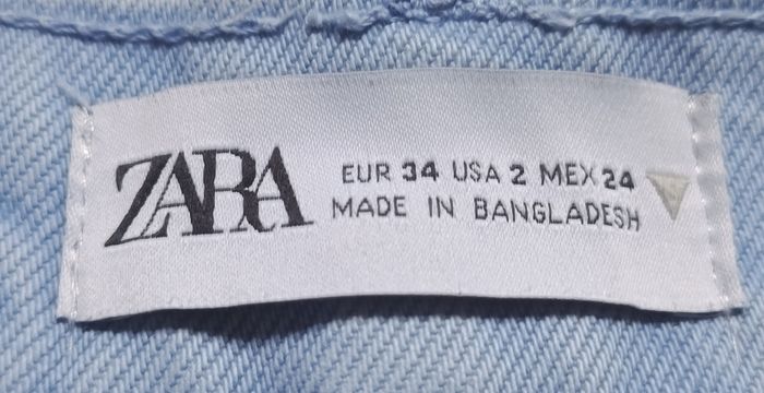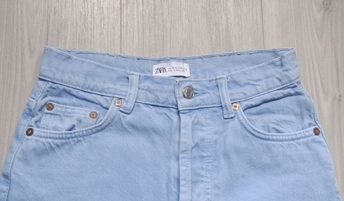 Jean de couleur bleu clair. Petite ouverture sur le devant à l'aide de 5 boutons. Jambes larges. 4 poches : 2 devant et 2 derrière. Marque Zara. Taille 34 (XS). N'a jamais été porté. Article neuf sans étiquette