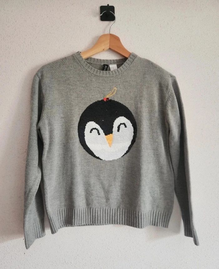 Pull gris H&M à paillettes réversibles – Motif pingouin / Noël – Taille XS - photo numéro 1