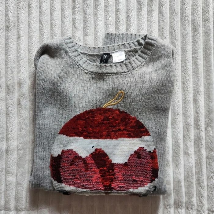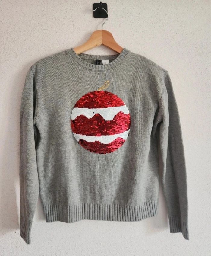 Pull gris H&M, taille XS, en très bon état. Maille douce et chaude, coupe droite confortable. Motif à paillettes réversibles : Pingouin / Boule de Noël rouge et blanche • Taille : XS • Longueur : 53 cm • Épaules : 43 cm • Matière : 95 % acrylique, 5 % polyester • Très bon état Pull original et festif, idéal pour la période de Noël ou les looks d’hiver décontractés. Maison non-fumeur, envoi rapide. #HM #PullNoel #PullHiver #PullGris #PaillettesReversibles #TailleXS #PullFemme