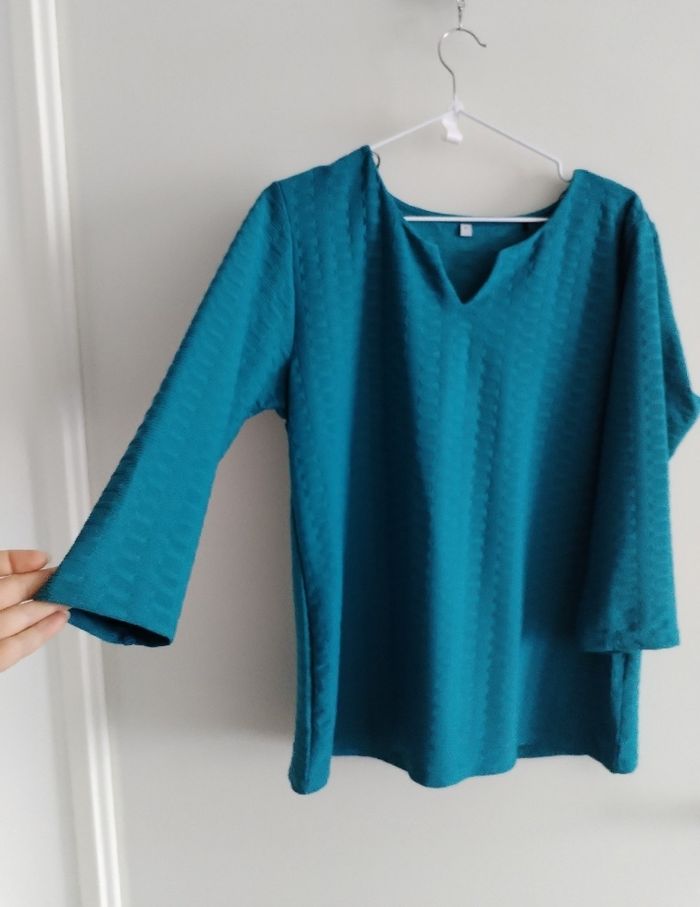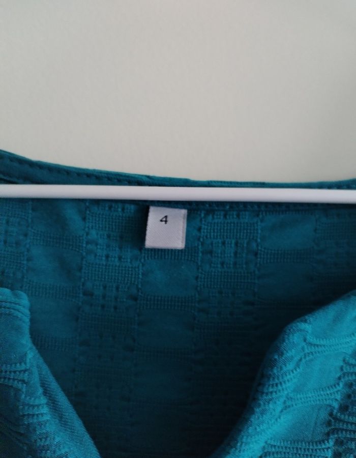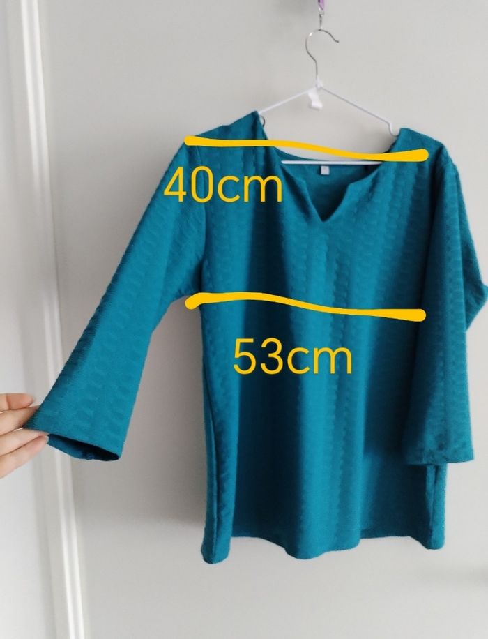 Très belle couleur pour ce haut taille 4 (44), qui est extensible et par conséquent extrêmement confortable. Les dimensions sont sur les photos. Le motif en relief est vraiment joli. Comme à mon habitude je l'ai acheté et laissé dans mon dressing. Il est donc tout neuf, jamais porté. J'ai également ce modèle dans une autre couleur, tout aussi joli.