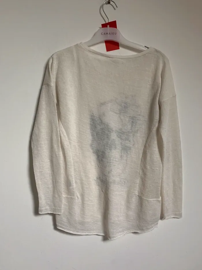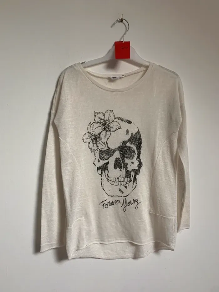 Ma petite friperie vous propose ce joli pull un peu transparents avec motif tête de mort sur le devant, idéal pour l’automne. #article704