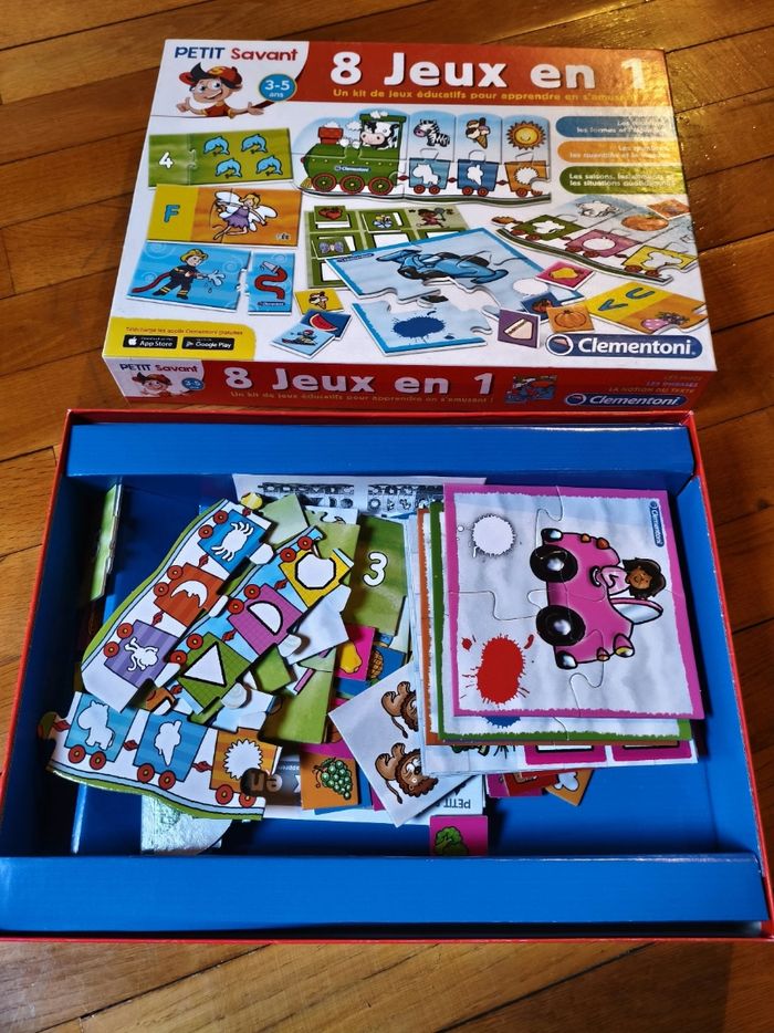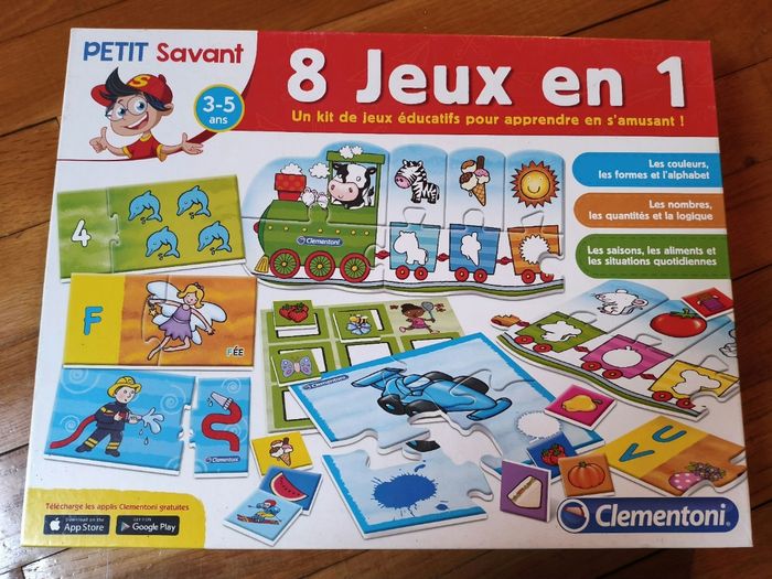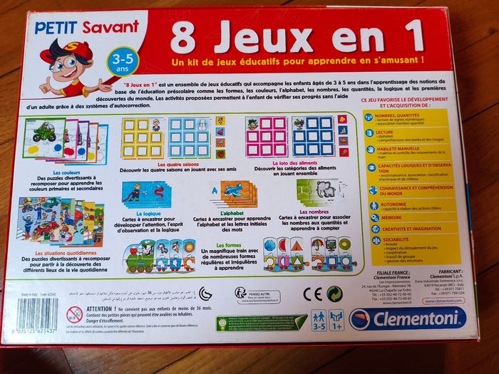Jeu de société, 8 jeux en 1, petit savant. Marque Clémentoni. Très bon état car très peu utilisé. Couleurs, formes, alphabet, nombre, quantité, logique, saisons, alimentation et situations quotidiennes. À partir de 3 ans.