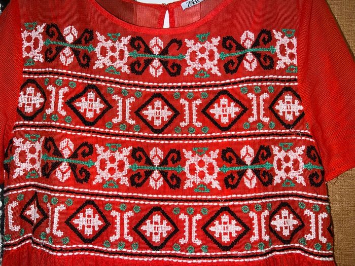 Robe rouge, avec une première épaisseur en tule brodé sur le buste et une seconde épaisseur (ou seconde robe) dessous moulante en matière élastique. Quelques fils tirés au niveau de la robe tule (voir photos)