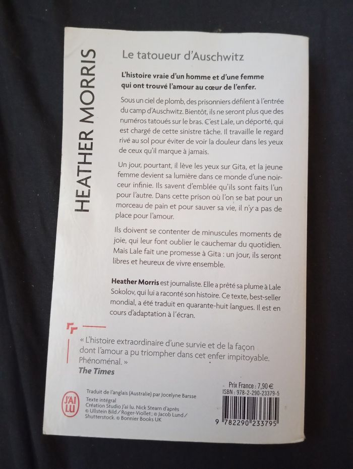 Je vends ce roman "Le tatoueur d'Auschwitz" de Heather Morris. - Titre : Le tatoueur d'Auschwitz - Auteur : Heather Morris - Genre : Autre - Éditeur : J'ai lu Bon état N'hésitez pas à me contacter pour plus d'informations !