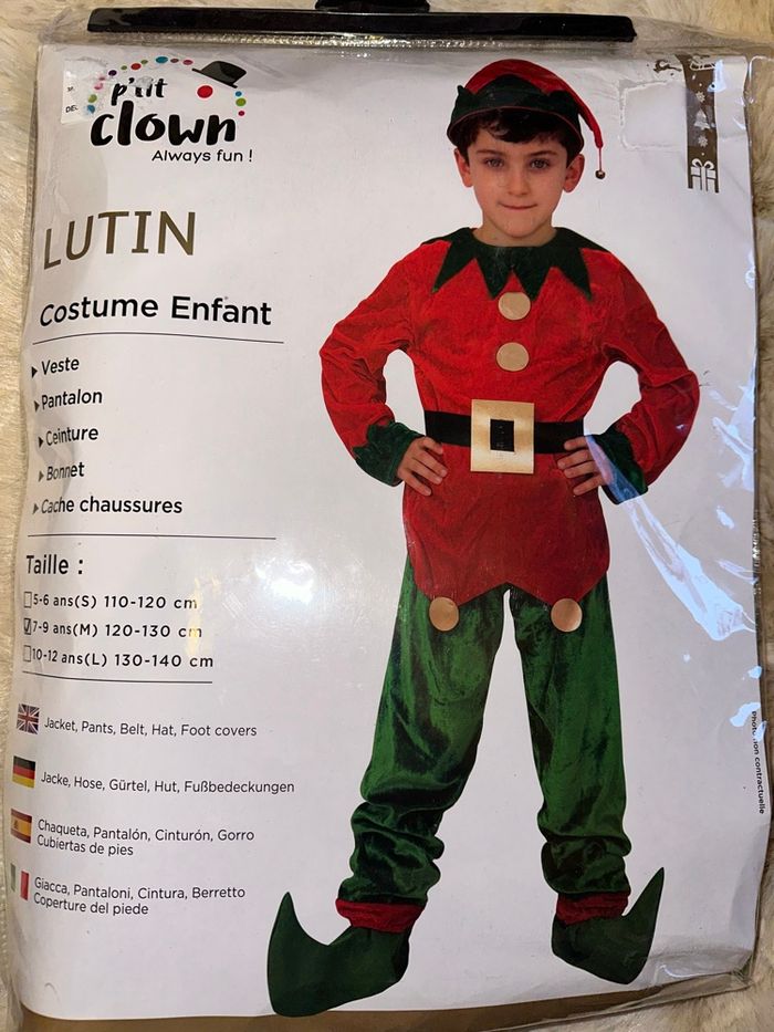 Costume lutin enfant, 7/9 ans soit 120/130 cm, le costume comprend, la veste, le pantalon, la ceinture, le bonnet et cache chaussures #7anskay57070 #8anskay57070 #9anskay57070 #costumenoel