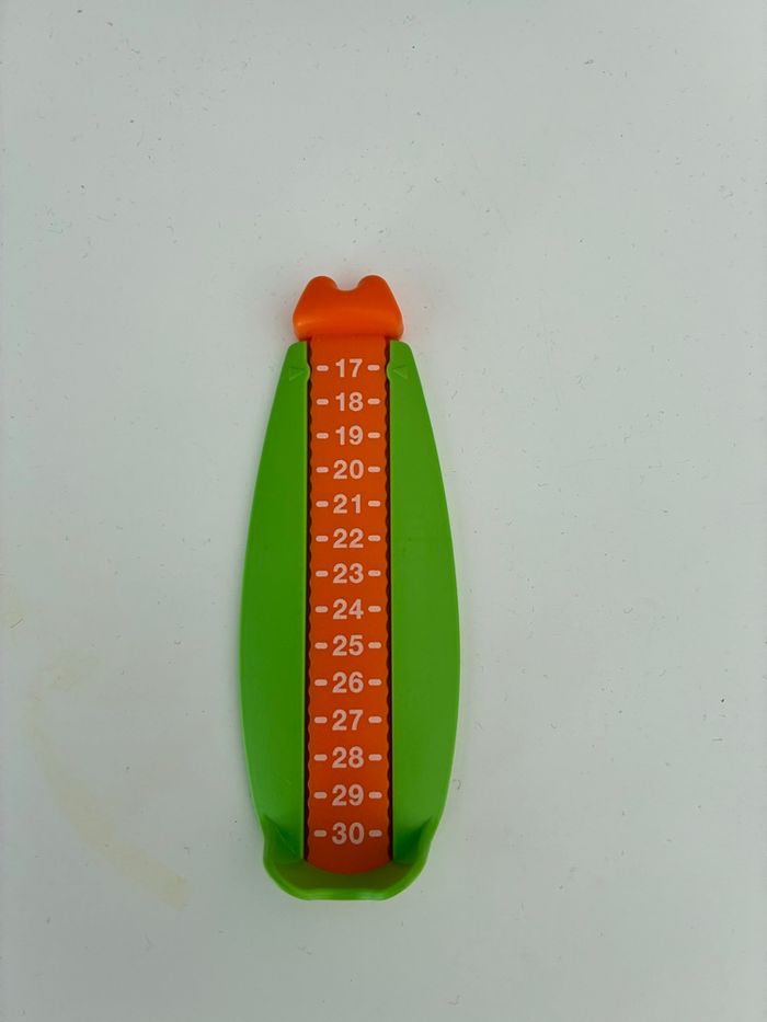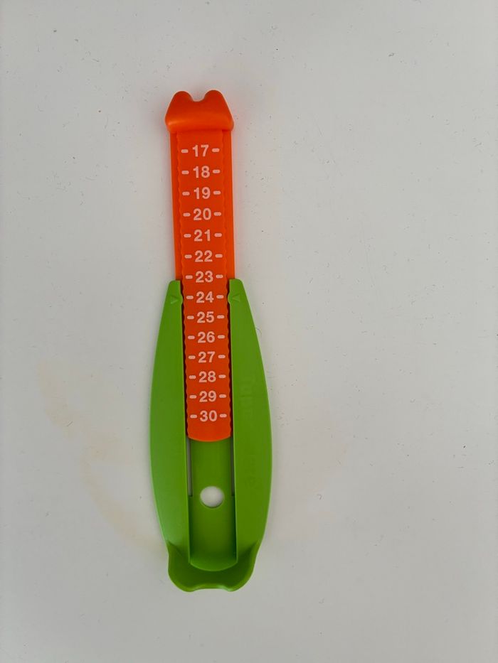 Périmètre de marque Tupperware, parfait pour mesurer la taille des pieds des petits enfants puisqu’il va du 17 au 30. Très bon état