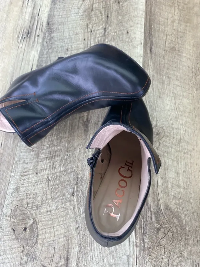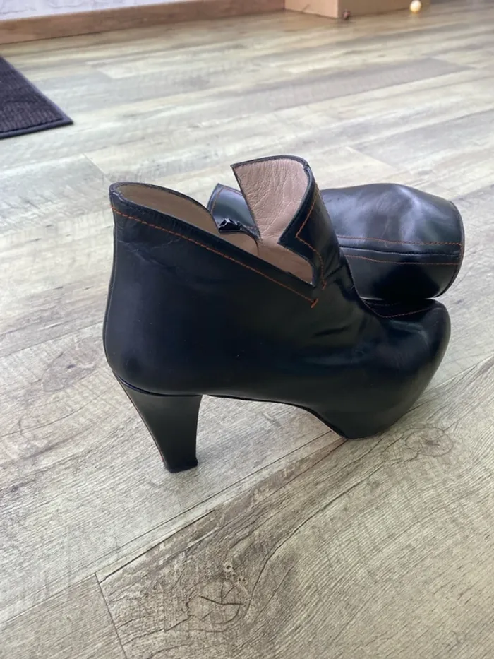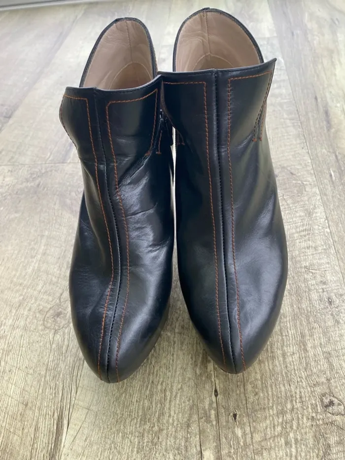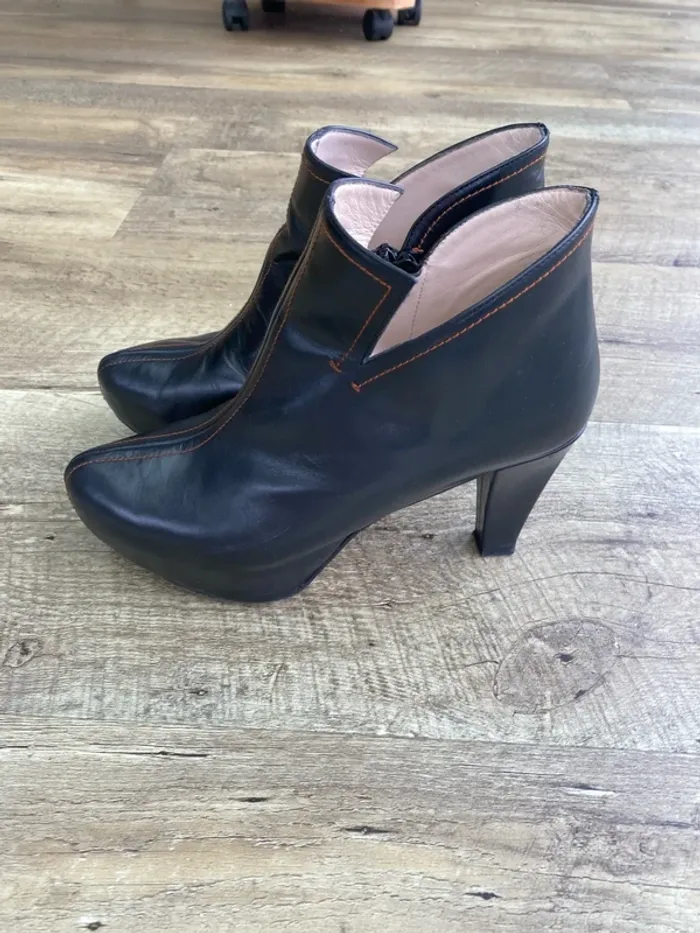 Bottines à talons noires avec surpiqûres orangées. Tige 19cm et talon 9cm . Taille 37 . Marque Pacogil . En Cuir . B on état.