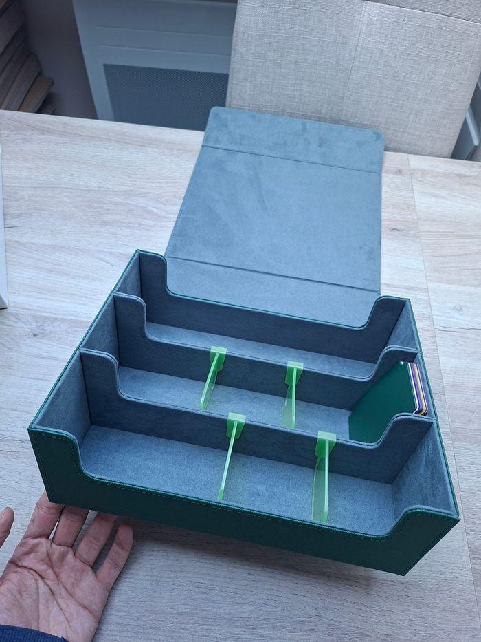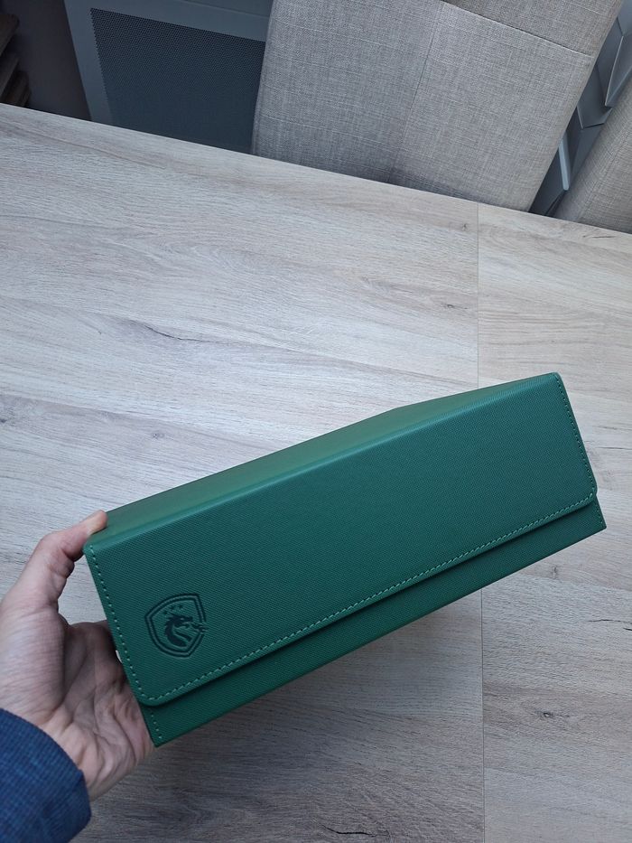 Boîte de rangement FireMint avec logo pour cartes TCG (Pokémon, One Piece, Yu-Gi-Oh!, Magic, Lorcana…). ✔️ Capacité jusqu’à 1800 cartes (sous sleeves) ✔️ Intérieur suédine douce ✔️ Fermeture aimantée sécurisée ✔️ Matériaux premium COLORIS -> VERT 🟩 🎁 Inclus : 10 intercalaires de couleurs différentes 4 séparateurs assortis à la boîte 📦 Produit sans défaut jamais utilisé sous blister . 💰 Prix : 19,99 €