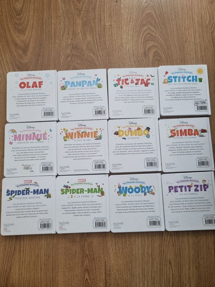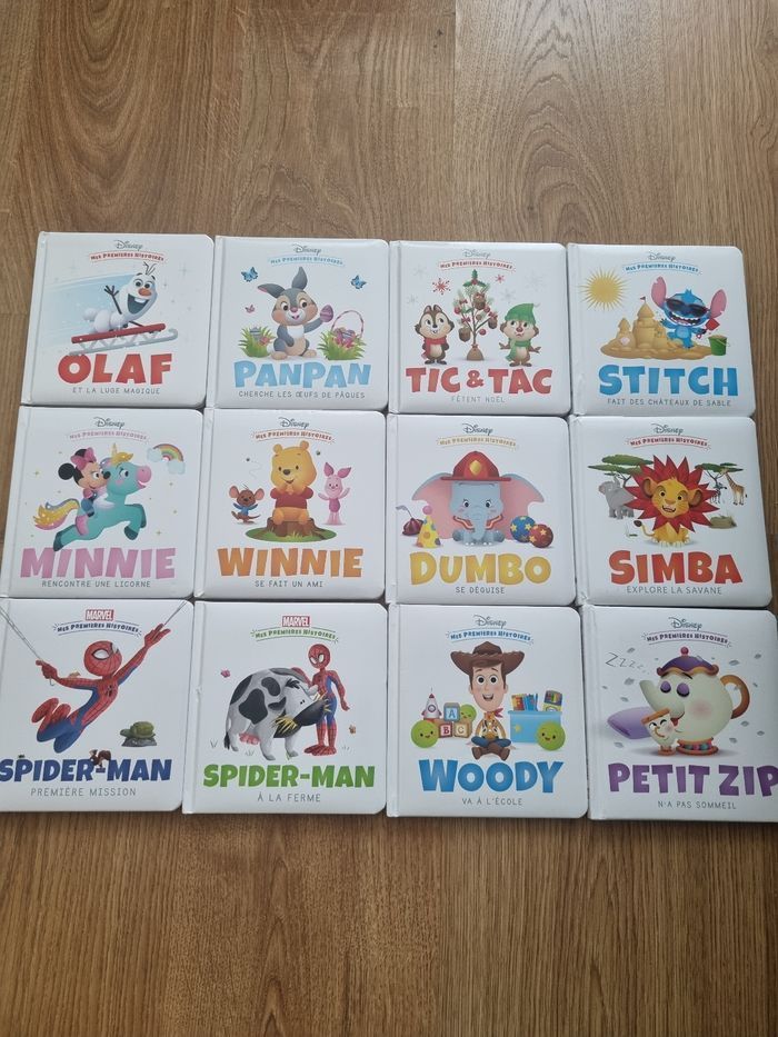 Lot 12 livres Disney "mes premières histoires" en très bon état Seul un accroc est a signalé sur la couverture d'un des livres - Olaf et la luge magique - Panpan cherche les œufs de pâques - Tic et Tac fêtent Noël - Stitch fait des châteaux de sable - Simba explore la savane - Dumbo se deguise - Winnie se fait un ami - Minnie rencontre une licorne - Spiderman premières mission - Spiderman à la ferme (accroc sur la couverture cf photo) - Woody va à l'école - Petit Zip n'a pas sommeil