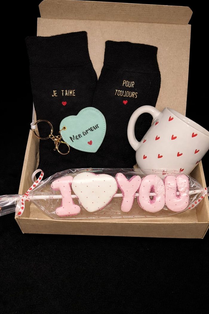 Faites fondre le cœur de la personne que vous aimez avec cette box pleine de tendresse, idéale pour la Saint-Valentin 💕 🎁 Contenu de la box : ☕ Une tasse cœur: parfaite pour des moments doux au quotidien 🧦 Une paire de chaussettes personnalisées avec les messages « Je t’aime » et « Pour toujours » 🍭 Une sucette spéciale “I LOVE YOU”, pour une touche gourmande et romantique 🔑 Un joli porte-clé personnalisé, à garder toujours près de soi ✨ Chaque élément est soigneusement choisi et personnalisé pour créer un cadeau unique, rempli d’amour et d’émotion. 🎀 Idéal pour surprendre et faire plaisir à coup sûr 👉 Offrez plus qu’un cadeau… offrez une déclaration d’amour inoubliable 💘