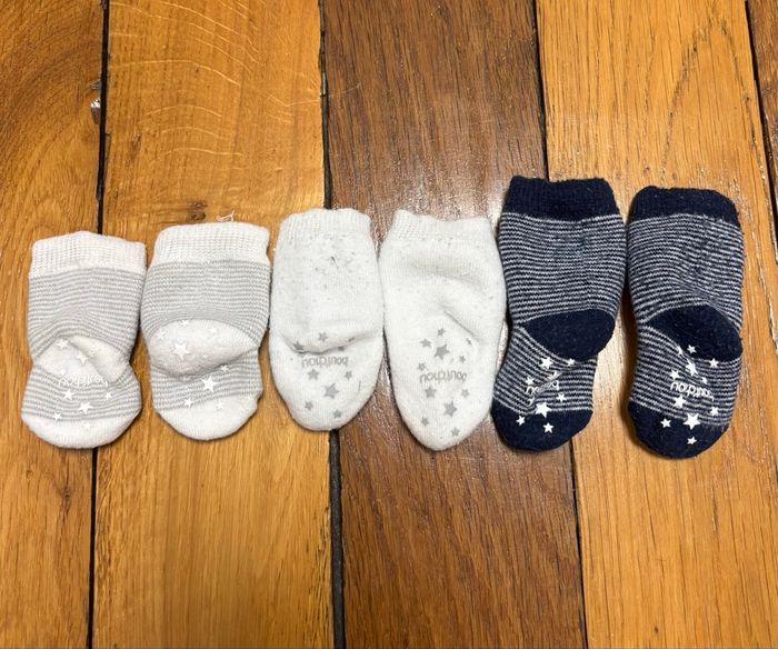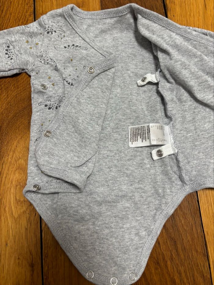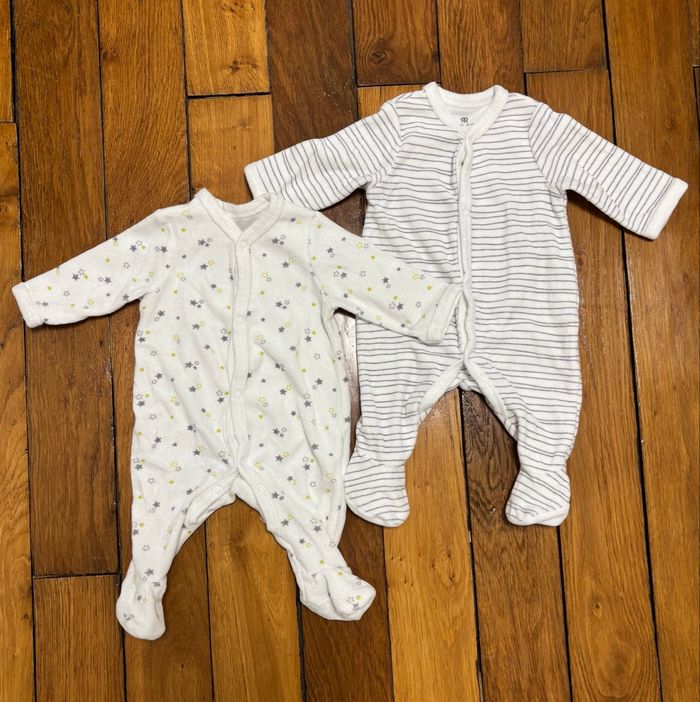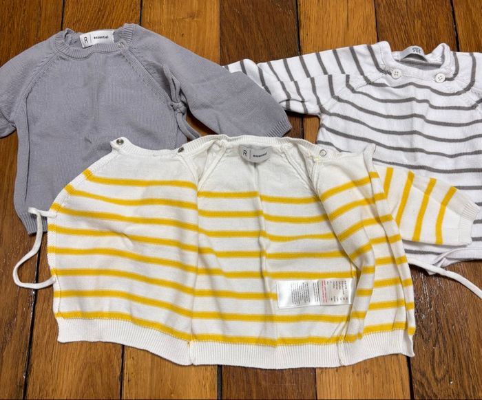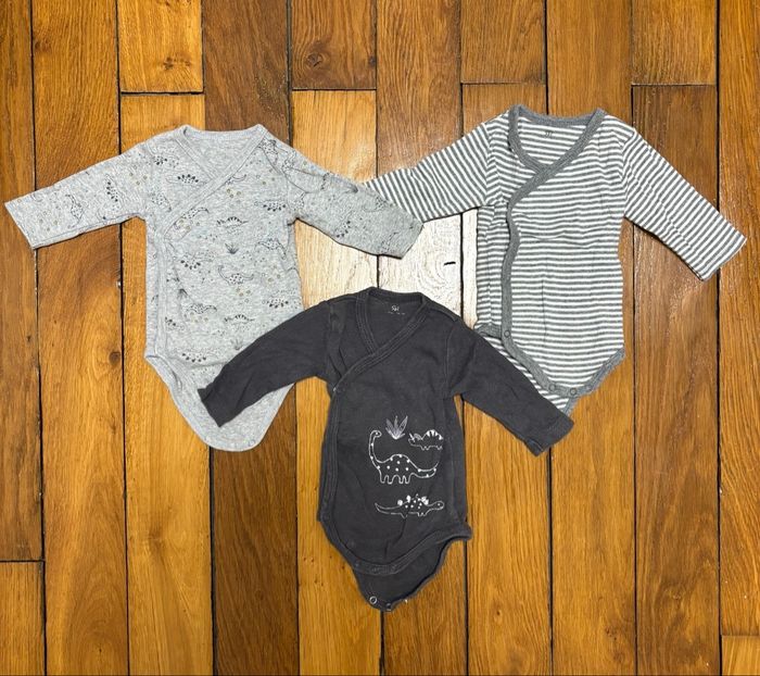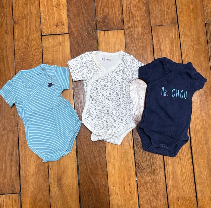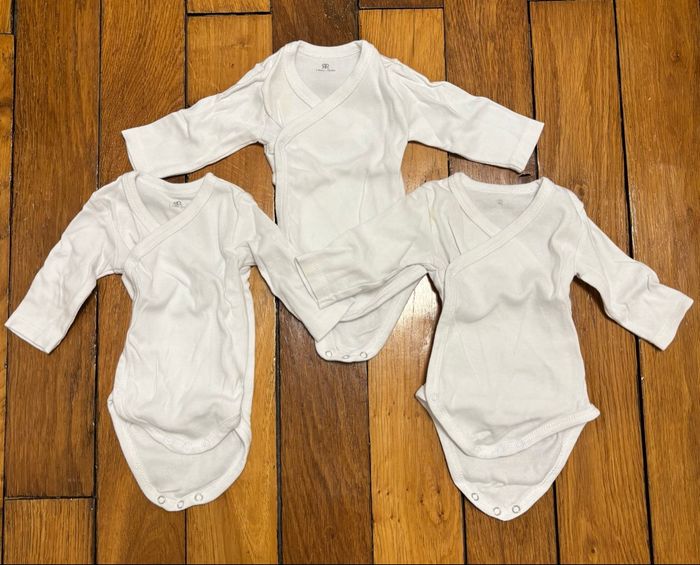 Lot naissance / nouveau-né idéal pour préparer la valise de maternité. Ensemble complet en taille 1 mois, pratique et prêt à l’emploi. Détails : • Taille : 1 mois (nouveau-né) • Marques : • La Redoute (vêtements) • Boutchou – Monoprix (chaussettes) • Contenu (19 articles) : • 6 bodies manches longues cache-cœur (3 blancs + 3 à motifs dinosaures / rayures) • 3 bodies manches courtes cache-cœur (motifs marin, poissons, texte « Mr Chou ») • 3 gilets / chandails cache-cœur à fermeture croisée • 2 pyjamas velours avec pieds (pressions devant et à l’entrejambe) • 1 pyjama sans pieds 100 % coton • 1 bonnet assorti • 3 paires de chaussettes nouveau-né 👉 Tous les bodies sont cache-cœur, fermeture idéale pour les premiers jours. Matières : • 100 % coton pour la majorité du lot • 2 pyjamas velours : 75 % coton / 25 % polyester État : • Excellent état • Aucun trou ni tache • Pressions et fermetures OK Maison non-fumeur, sans animaux.
