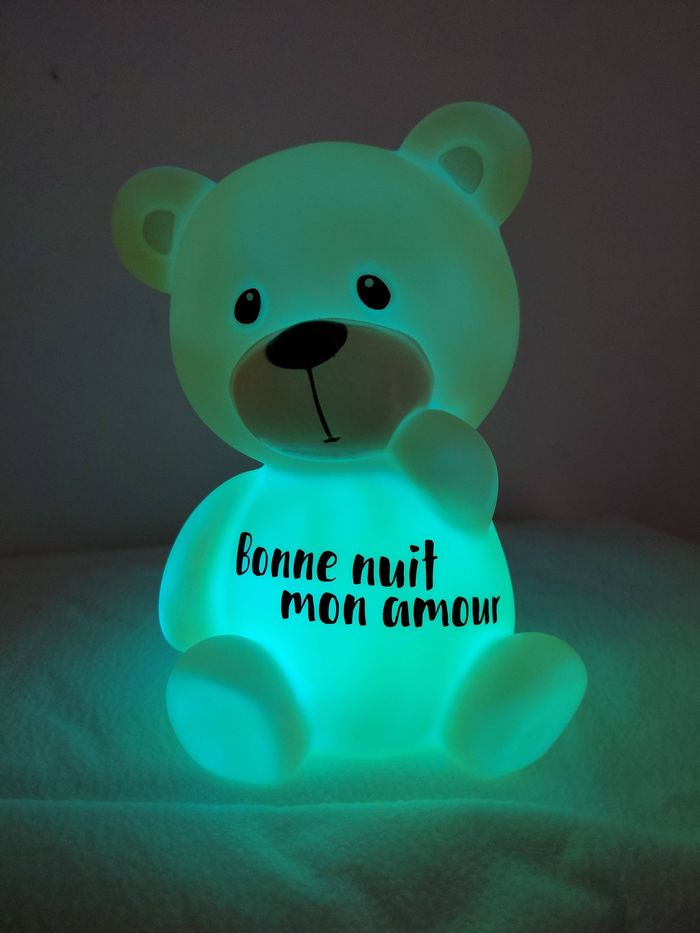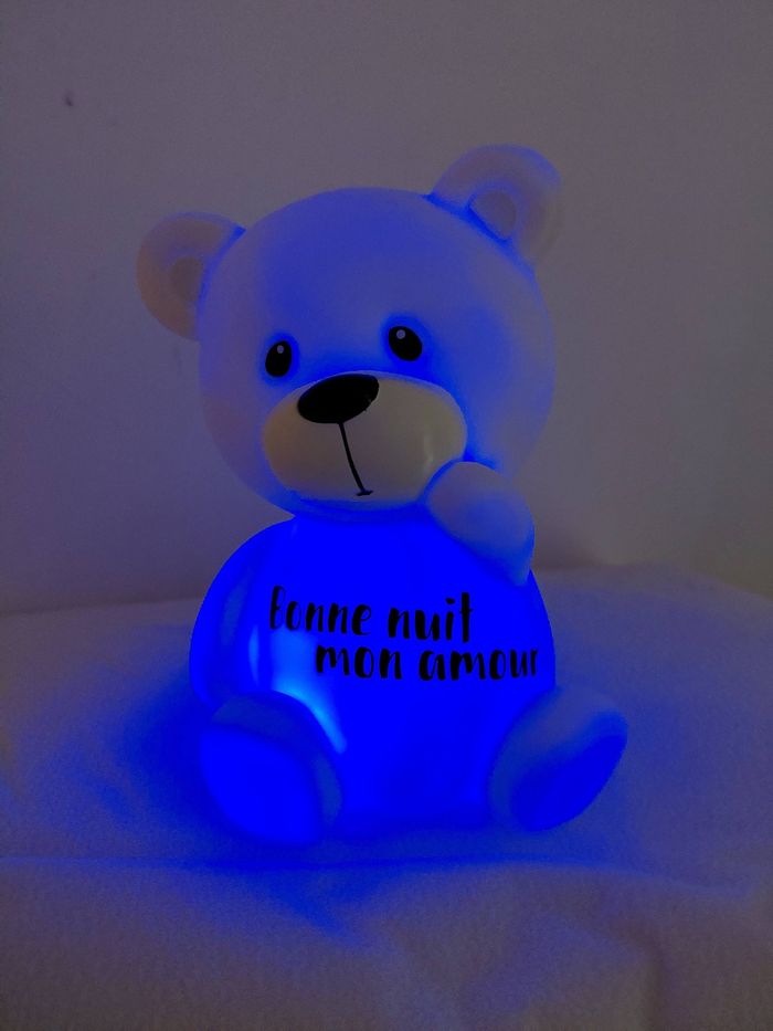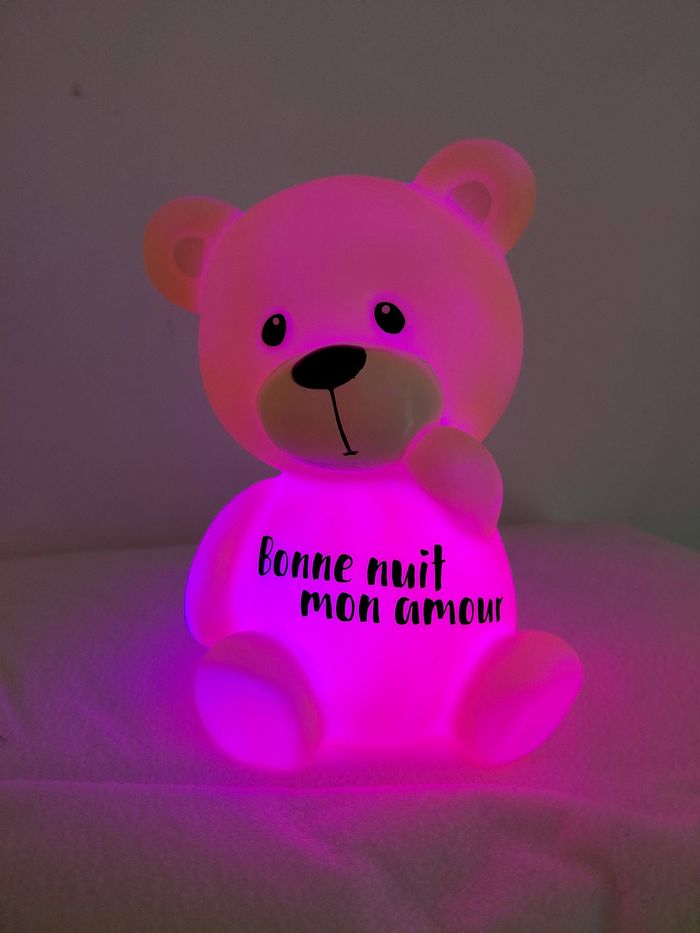 💛Veilleuse Ourson “Bonne nuit mon amour” 💛 Offrez un moment de tendresse avec cette adorable veilleuse ourson personnalisée, parfaite pour accompagner les nuits des petits comme des grands. Son doux message « Bonne nuit mon amour » apporte réconfort et sérénité au moment du coucher. ✨ Veilleuse à changement de couleurs Grâce à son éclairage multicolore, la veilleuse diffuse une lumière douce et apaisante qui change de couleur, créant une ambiance rassurante et magique dans la chambre. 🧸 Un cadeau plein d’amour qui trouvera facilement sa place dans une chambre d’enfant, une chambre de bébé ou même comme décoration cocooning. 🌙 Une veilleuse pleine de douceur pour des nuits paisibles et remplies d’amour.