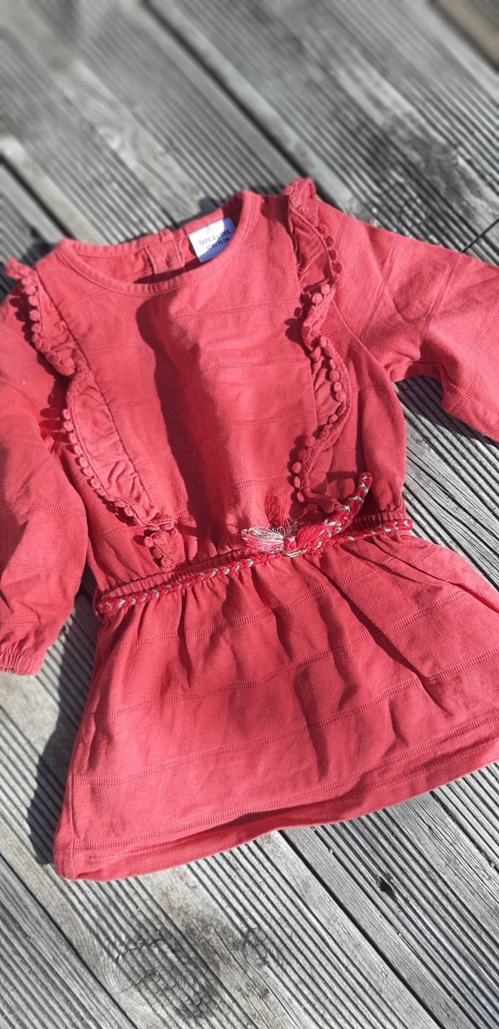 Robe tunique style bohème/ethnique Couleur brique Volant sur les épaules, devant et derrière Manches légèrement bouffantes Ceinture cordon taille basse Fermeture boutons dans le dos #vêtement #fille #robe #tunique #ethnique #bohème #12mois
