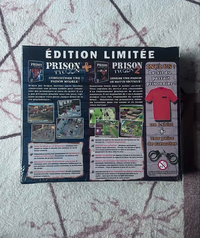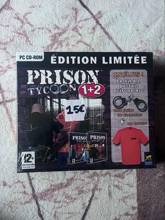 Coffret Pc cd rom Prison Tycoon 1+2 neuf Édition limitée Inclus une paire de menottes et un t-shirt en cadeaux Pour 12 ans et plus Sous blister Idéal pour offrir Construire une prison modèle et diriger une prison de haute sécurité Je réponds rapidement aux messages Envoi rapide et soigné