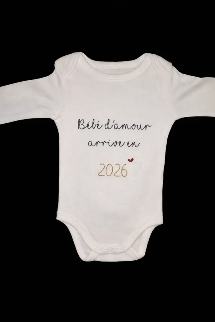 Body bébé personnalisé, idéal pour annoncer une grossesse de façon originale et émouvante 💕 Parfait pour surprendre le futur papa, les grands-parents ou les proches. ✨ Personnalisé "Bébé d'amour arrive en 2026" (écriture noire pailletée, date doré pailleté, cœur rouge pailleté) 🎁 Idée cadeau unique 📦 Envoi soigné et rapide N’hésitez pas à me contacter pour toute question ou demande particulière 😊 #annoncegrossesse #annoncegrossesseoriginale #bebe2026 #mininous