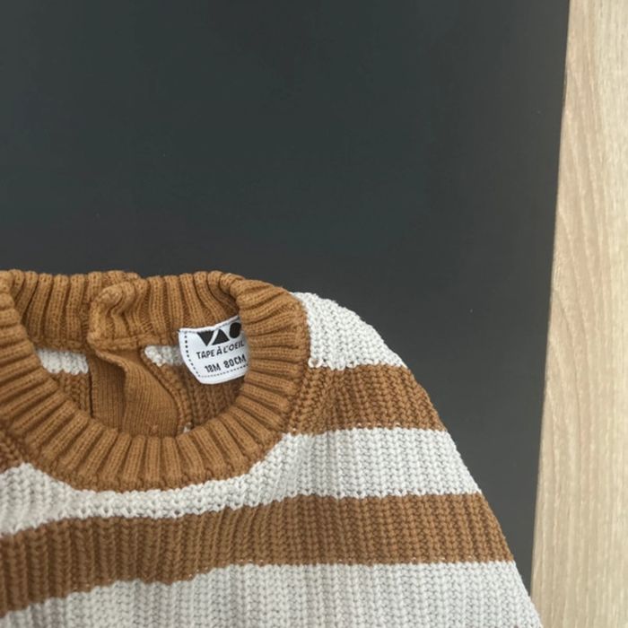Description : 🧶 Pull d’hiver en laine Tape-à-l’œil pour bébé ❄️ Chaud et doux, parfait pour les journées froides 🤎 Rayé crème et marron, style intemporel 👍 Taille 18 mois / 80 cm, très bon état