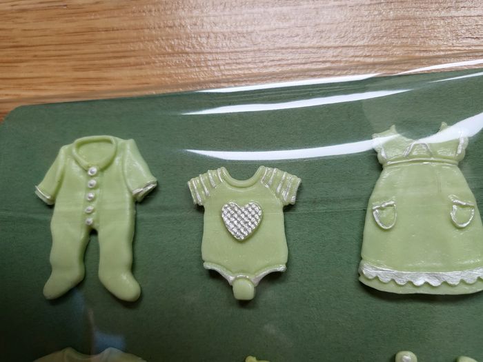 Des petits sujets à coller sur le thème naissance. A coller sur le support de votre choix. Dimensions de 1 cm à 4 cm. Matière porcelaine froide. Coloris vert pastel et blanc nacré.