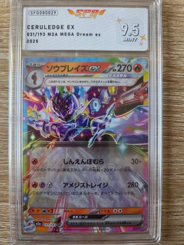 Je vends cette carte Pokémon Ceruledge EX japonaise, une édition limitée et notée 9,5 par le service de notation SPG. - Type de produit : Carte de jeu de collection Pokémon - Nom de la carte : Ceruledge EX - Édition : Japonaise - Notation : 9,5 (SPG)