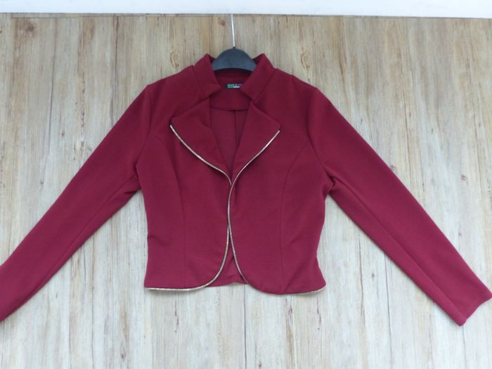 veste courte super sympa en taille unique parfait état matière très agréable car extensible et suit tous vos mouvement sans "tirer" super sur un jean large avec des basket pour un look de jour ou avec une jupe/robe et des talons pour le soir et un style chic attention la veste est bordeaux même si sur les photos elle fait plus claire
