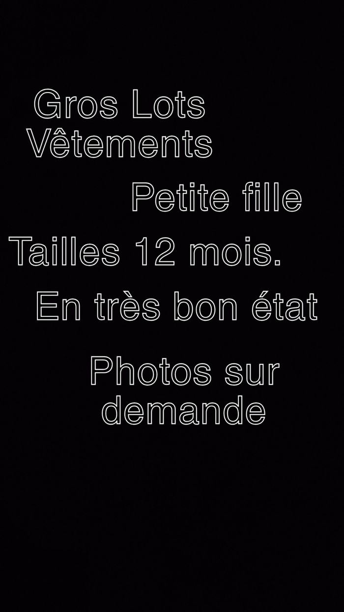 Bonjour, je vends les vêtements en gros lot en très bon état. Et différents marque. Tailles 12 mois. Leggings, bodie, robes, pulls, t-shirt.. J'ai pas le temps de faire en unités. Je peux vous envoyer des photo a la demande. 🙏