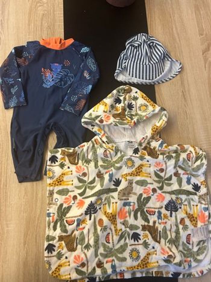 Description : ☀️ Lot bain bébé neuf, jamais porté : 1. 🩱 Maillot de bain une pièce Petit Béguin anti UV– 12 mois, manches longues, parfait pour protéger du soleil 2. 🧢 Casquette Kiabi – 3 à 6 mois, protection nuque incluse 3. 🛁 Cape Tao – 12–18 mois, idéale pour se sécher et garder bébé au chaud après la baignade 👍 Tout est neuf, jamais porté 🌊 Parfait pour les premiers bains, la plage ou la piscine 💰 Prix du lot : 20 € (négociable)